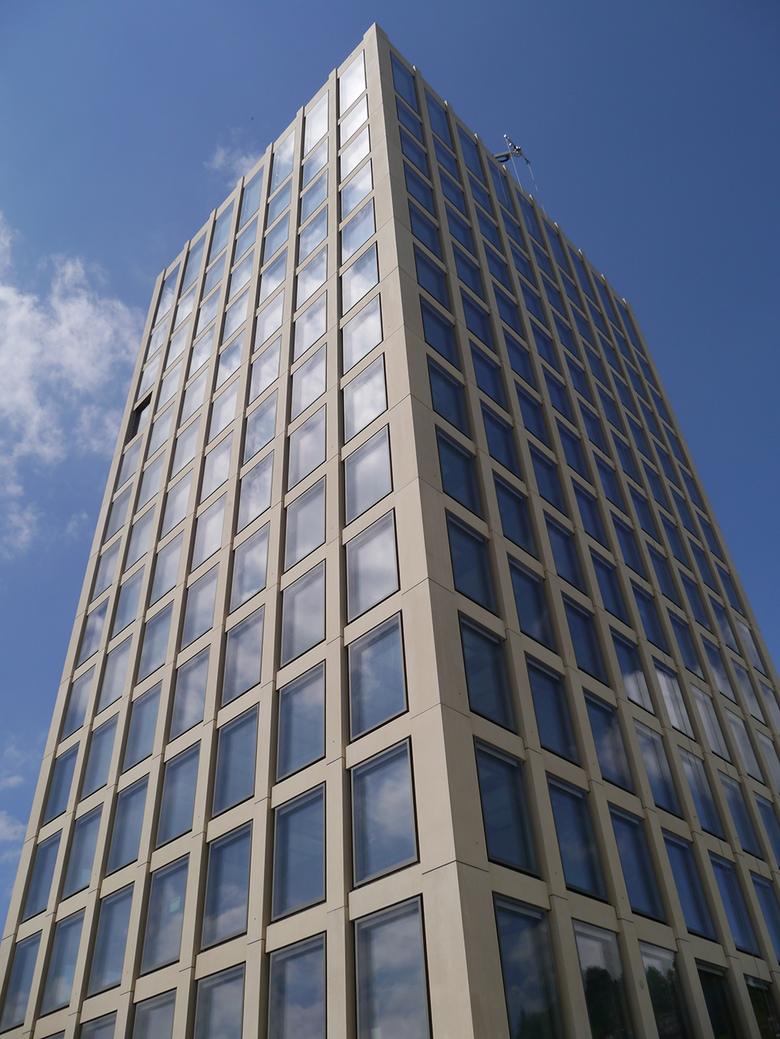 In prominenter Lage, direkt neben dem Hauptbahnhof St. Gallen, entstand die neue Fachhochschule. Ein grosser 5-geschossiger Sockelbau, der städtebaulich die Höhe der angrenzenden Bauten übernimmt, mit einem zentral angeordneten Hochhaus als Gegenüber vom hohen Rathaus, bildet den anspruchsvollen Gebäudekomplex. Das Hochhaus, in welchem sich die Institute der Schule befinden, ist als Skelettbau mit Flachdecken konzipiert. Es ist über den Erschliessungskern, welcher in den Decken des Sockels eingespannt ist, ausgesteift. Die weitgespannten und zum Teil vorgespannten Decken der Sockelgeschosse, wo sich Hörsäle, Mensa und Bibliothek befinden, ermöglichen auch später eine hohe Nutzungsflexibilität.
