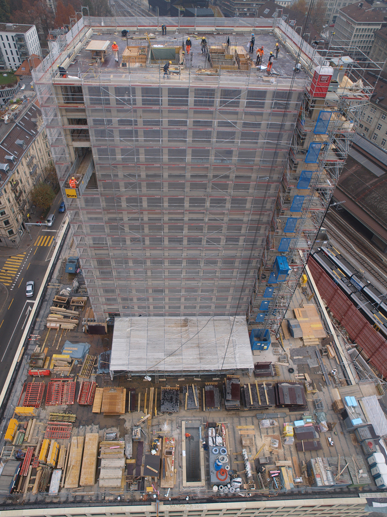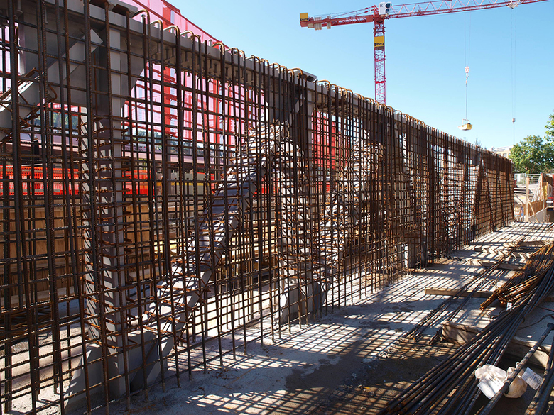 Im 1. und 2. Untergeschoss, wo vorherrschend Technikräume angeordnet sind, werden die Lasten des darüber liegenden Sockelteils über raumhohe, ebenfalls vorgespannte Wandscheiben derart verteilt, dass in den darunter liegenden Geschossen optimale Verhältnisse für ein komfortables Parking entstehen. Die Untergeschosse wurden im Schutz einer ca. 15m hohen rückverankerten Schlitzwand erstellt.