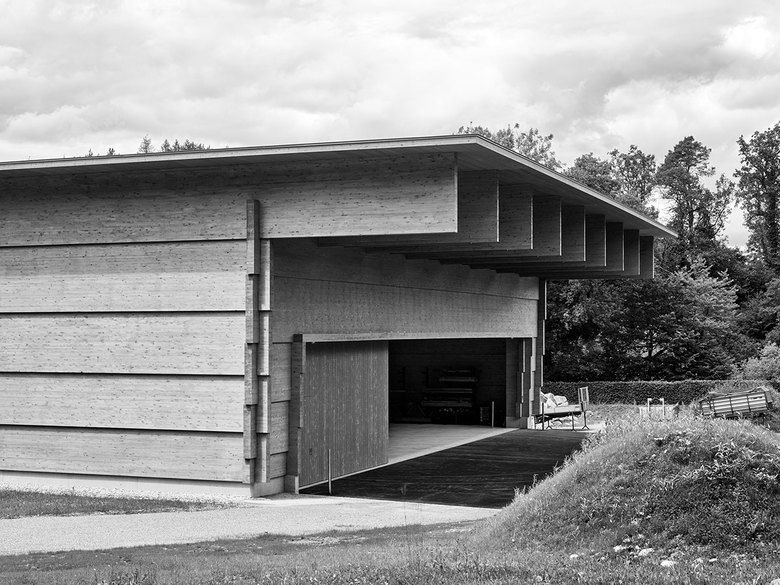 Das konstruktive Prinzip der Schichtung ist für den Massstab einbezogen: Zur Stabilisierung der kurzen Wände neben dem Tor und des schlanken Torträgers wird eine Leibung eingefügt, und auf der Rückseite werden die langen Holzträger zu einem grossen Regal erweitert, das nach innen hin praktisch nutzbar ist und nach aussen die Rückwand gegen den Wind aussteift. Abgedeckt wird die Halle durch Brettschichtbinder, die an der Torseite auskragen und ein Vordach bilden, und darauf aufgelegte Mehrschichtplatten. Durch die Steckverbindungen und die grosse Redundanz des Wandsystems konnte auf Stahlteile vollständig verzichtet werden.