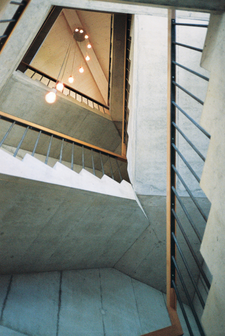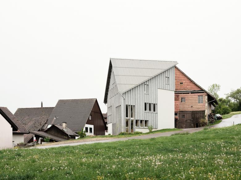 Hinterhueb – Ein Weiler, welcher von landwirtschaftlichen Wohn- und Ökonomiegebäuden geprägt ist, soll durch ein Einfamilienhaus ergänzt werden. Die Aufgabe bestand darin, ein Wohnhaus auf einem Reststück einer grösseren Parzelle zu realisieren. Die dreieckige Geometrie resultiert aus der Parzellenform und den Auflagen der Kernzone. Die verschieden Nutzungen werden aufgrund des kleinen Grundrisses gestapelt und vertikal organisiert. Die Konstruktion ist erlebbar und die Materialien sind präsent.