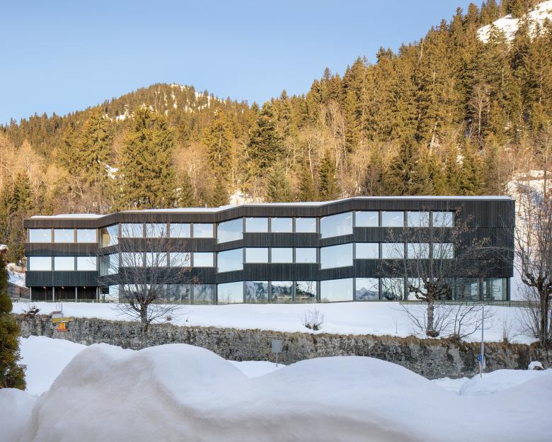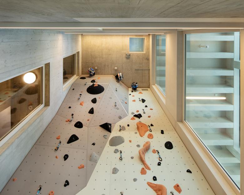 A l’image des établissements de soins pour enfants caractérisant le lieu, le projet s’implante en étirant une grande coursive sur la largeur de la parcelle. Il profite ainsi au maximum de l’orientation solaire et visuelle de la situation. Par de légers déboitements le volume produit des dégagements vers le grand paysage caractérisé par la présence des célèbres Dents-du-Midi. Cette coursive ensoleillée tournée vers les crêtes alpines offre de multiples possibilités d’appropriation pour les groupes qui y séjourneront : salons d’étage, mur de grimpe, salle polyvalente, bars, ...