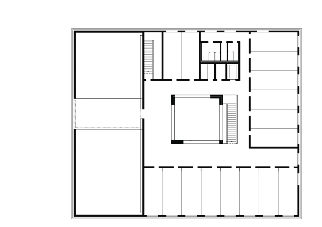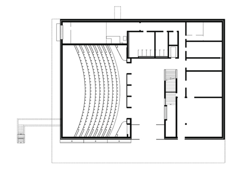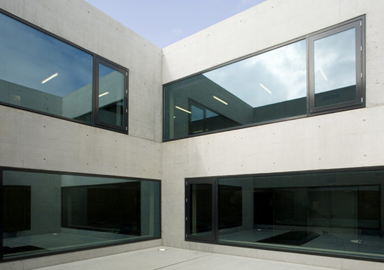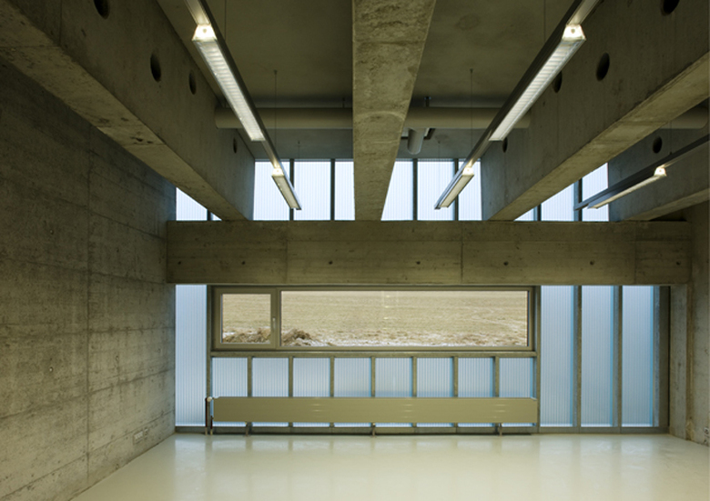 Au rez-de-chaussée un grand foyer ouvert sur l’extérieur distribue d’un côté la montée dans les étages et, de l’autre, l’auditoire de deux-cents places. Ce dernier est conçu comme un volume simple en béton, avec une feuille de plâtre qui se plie pour façonner, dans un mouvement unique, le faux plafond acoustique et la surface de projection. La disposition polychromatique des sièges de la salle a été conçue par l’artiste Daniel Schlaepfer. Les deux étages supérieurs sont articulés autour d’un patio intérieur à ciel ouvert et accueillent l’ensemble des locaux d’instruction et des bureaux.