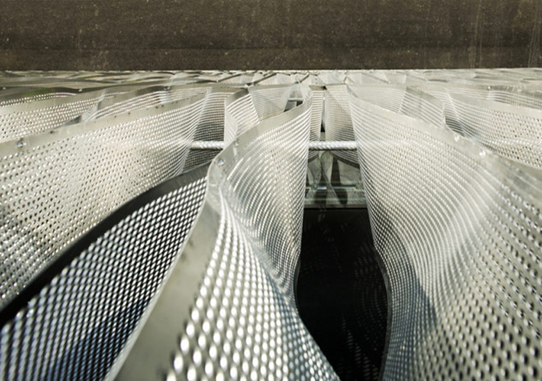 La conception de la façade met en rapport des éléments verticaux, sous la forme de tôles en aluminium perforé ondulant légèrement, avec la frondaison des arbres. Face à une demande programmatique complexe, impliquant des ouvertures disposées au gré des fonctions, cette peau devient l’élément unitaire expressif. La fonction de protection solaire vient s’ajouter à la cohérence architecturale.