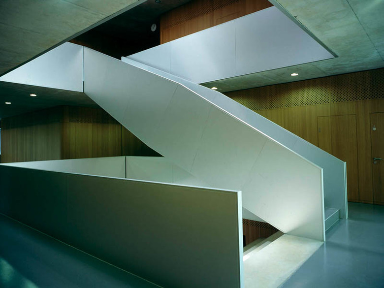 Les parties communes du collège sont matérialisées par la présence d’une feuille de bois verticale qui se déroule le long des façades intérieures en dialectique avec la structure. Le béton est laissé apparent au plafond et sur les éléments porteurs. Une grande prise de jour naturel, se jouant de la plasticité du béton armé en référence au «canon de lumière», porte un éclairage sur l’escalier principal, tout en mettant en scène la course solaire dans un effet d’ombres et de rayons de lumière.
