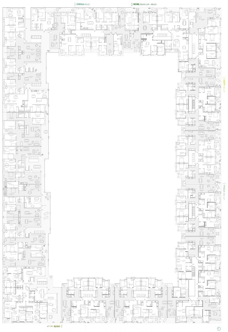 Dans cette forme urbaine issue d’un concours d’urbanisme, le parti favorise de manière générale les appartements bi-orientés où la question typologique va plus loin que la terminologie du traversant. En effet il est proposé que presque tous les appartements de cette catégorie possèdent un espace qui permette une vue intérieure, de la rue à la cour, et soit agrémenté d’un prolongement extérieur.