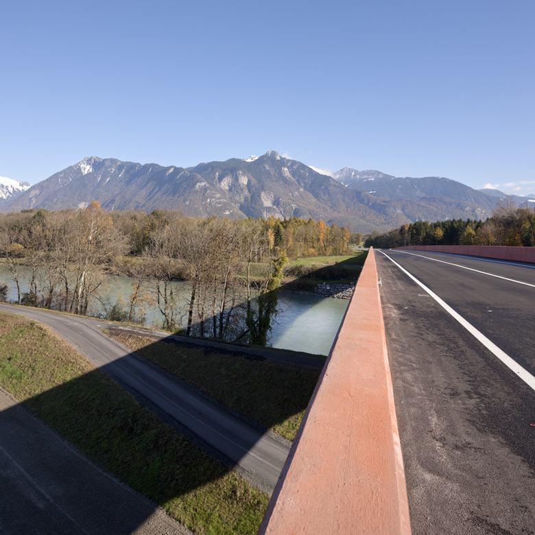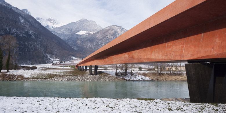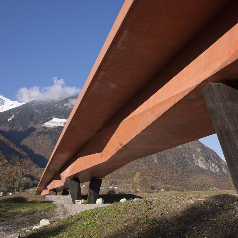Le concept retenu met en place un objet continu qui exprime la répartition des efforts statiques mis en jeu. L’unité de la forme permet d’«enjamber» les irrégularités de la terre et d’interagir dans ce lieu de manière raisonnée par une augmentation progressive de la portée, basée sur le principe mathématique des courbes harmoniques. Les soixante-quatorze mètres nécessaires au franchissement du Rhône sont ainsi intégrés dans cette logique, quasi mathématique, où l’effort maximum se fond «naturellement» dans l’unité de l’ouvrage d’art, sans effort visuel particulier. Le béton qui compose la matérialité du pont est teinté, afin d’inscrire une «ligne rouge» dans le territoire.