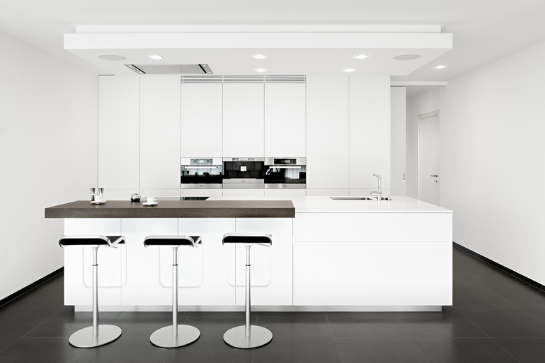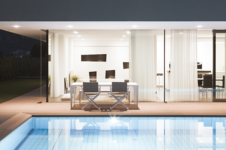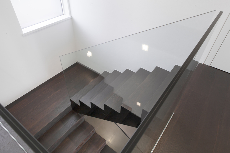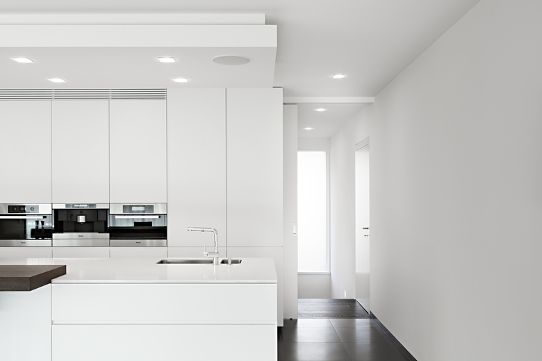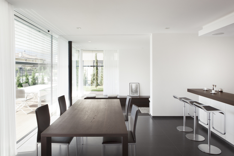Una parete continua parallela alle vetrate divide la zona notte dalla zona giorno, per questo emerge una chiara e funzionale divisione degli spazi interni a favore di una illuminazione differenziata.