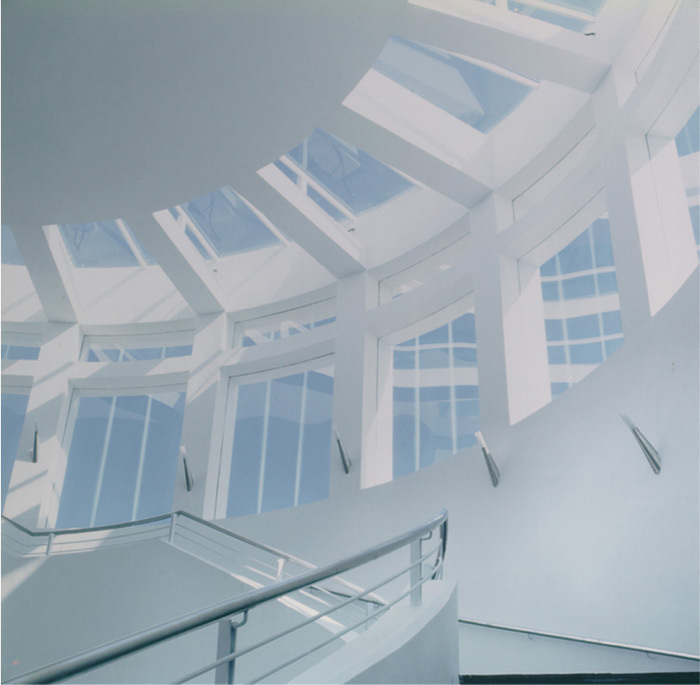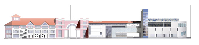 The empty infill land and the pink-color neighbor - the museum is located at a site with/out context. As a response, its exterior with color white, gray and blue de-constructs the sweetness of its neighbor; a paragraph of ancient Chinese freeform calligraphy softens the massive exhibition cube, which becomes a unique context of the future neighborhood.