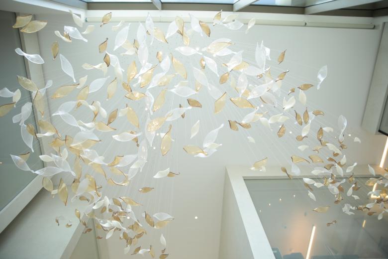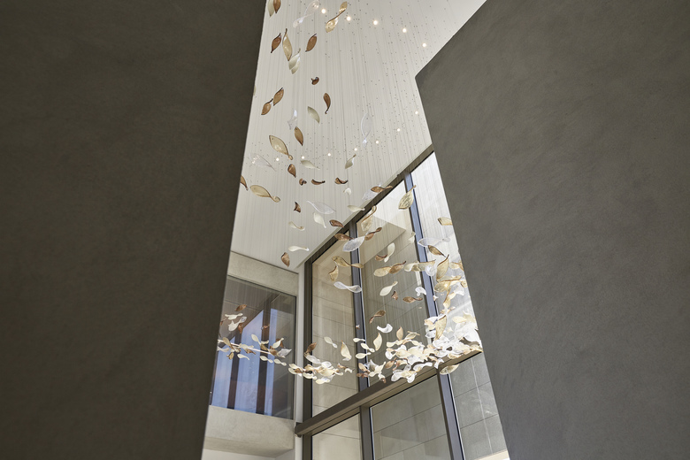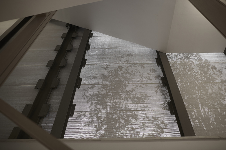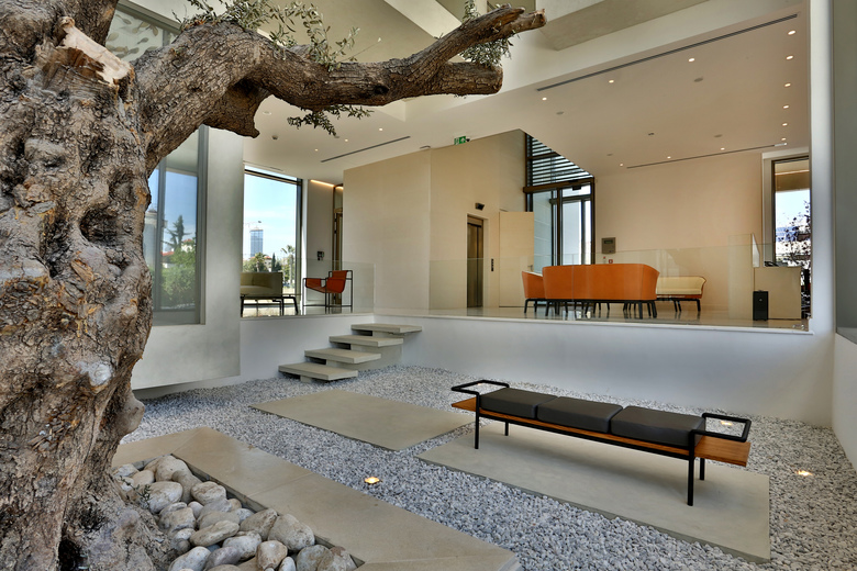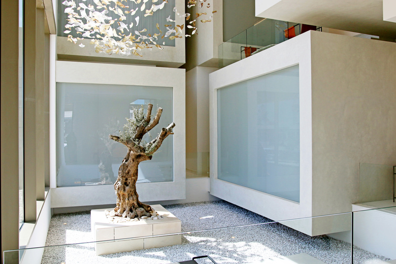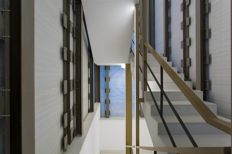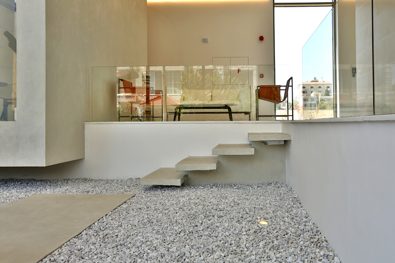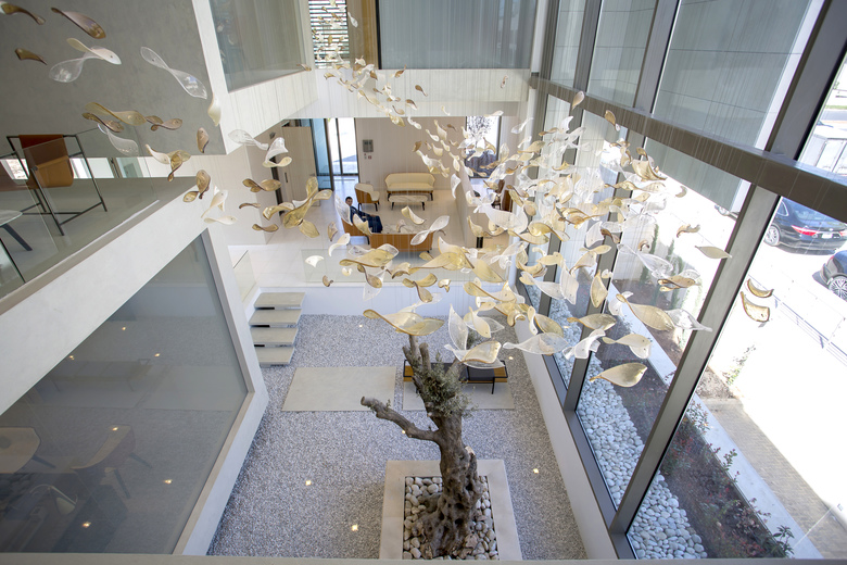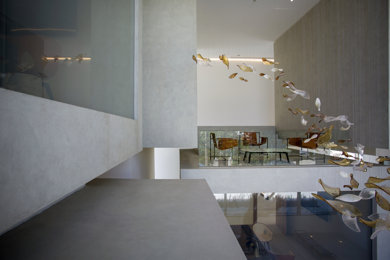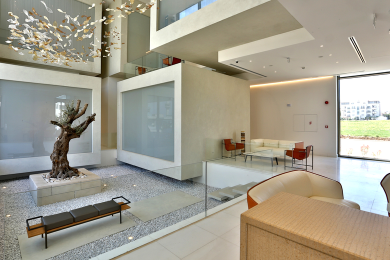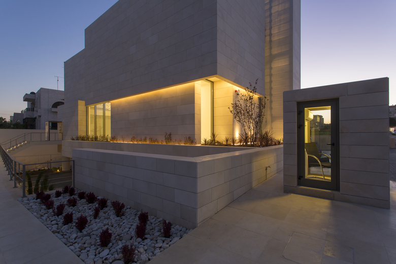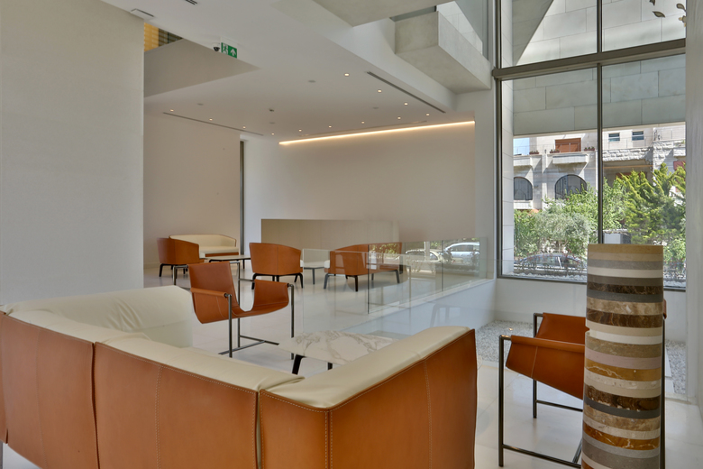 The bank’s VIP branch needed to create a bold yet graceful architectural statement in harmony with the surrounding residential neighborhood. This translated into a building with solid stone facades reflecting the massing of the interior offices as well as translucent concrete displaying a unique relationship of solid and void.