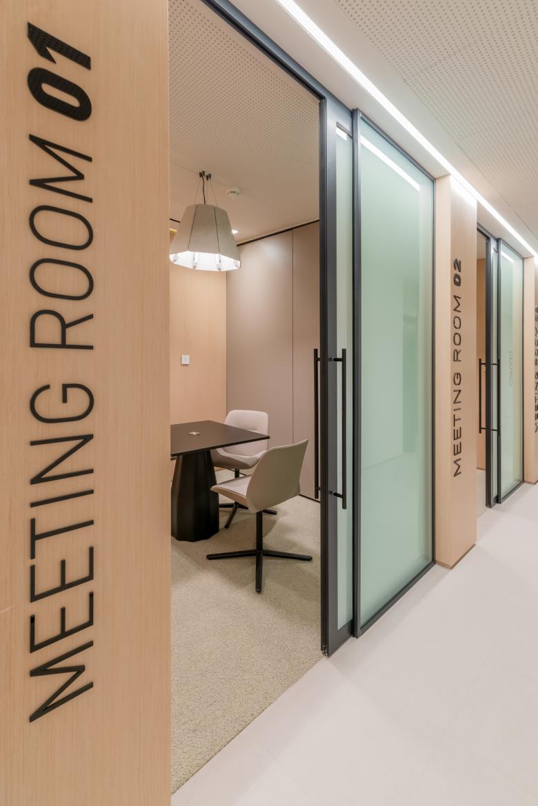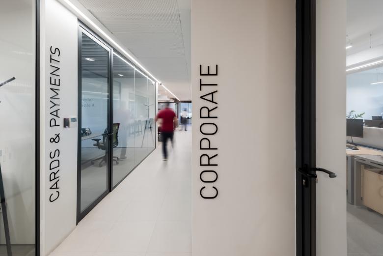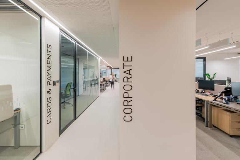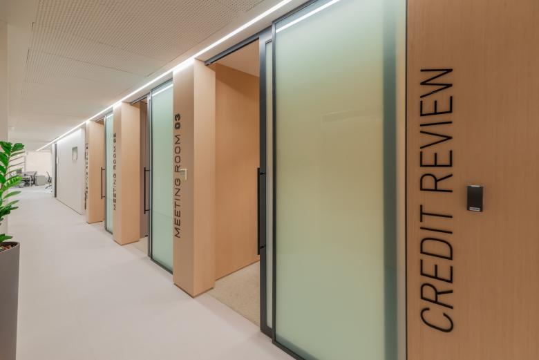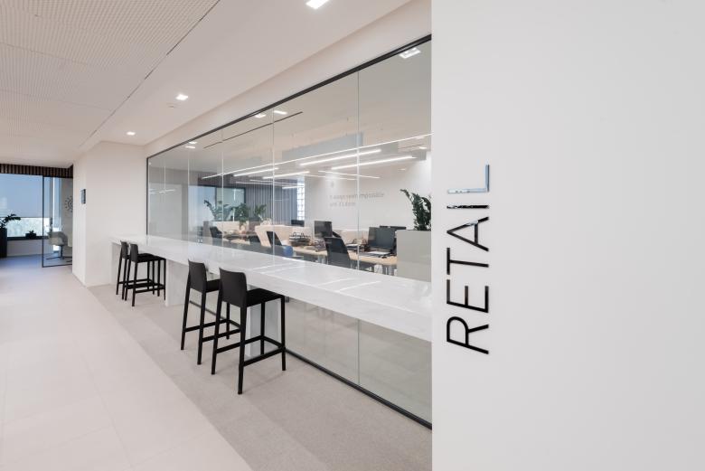 The open-plan layout fosters collaboration and communication among employees, while the incorporation of natural light and greenery enhances the overall ambiance. The bank's branding elements are seamlessly integrated into the design, creating a cohesive and recognizable atmosphere.