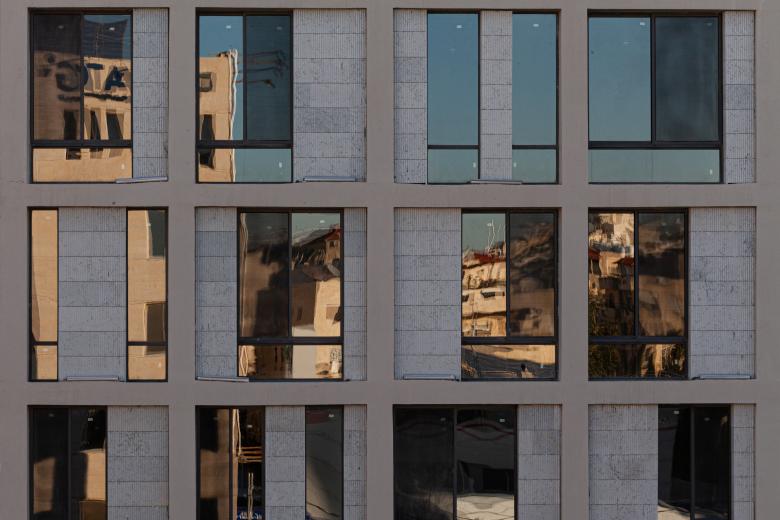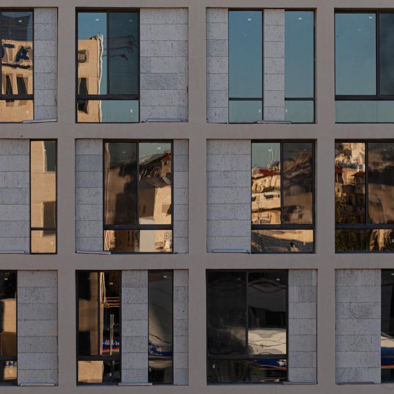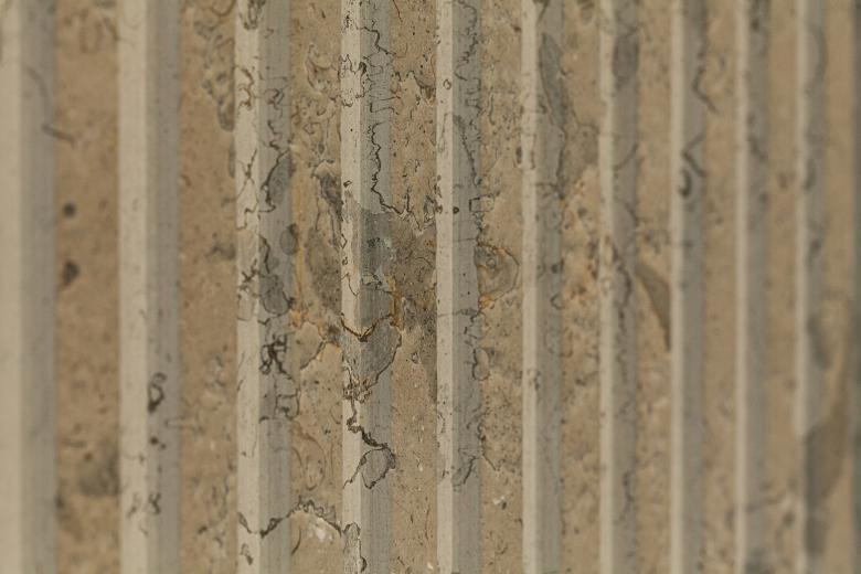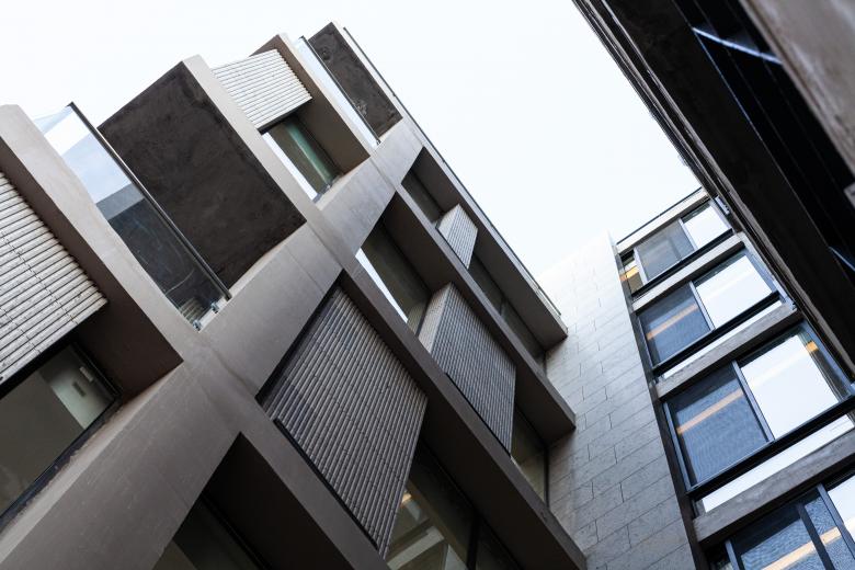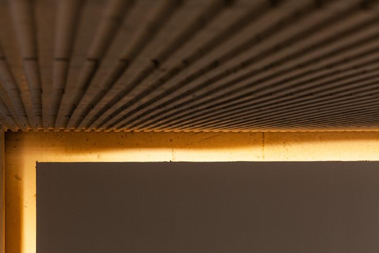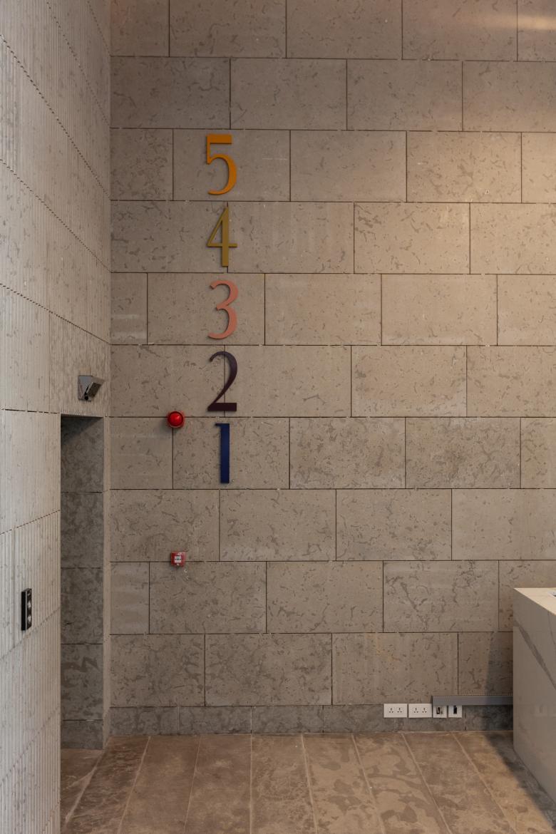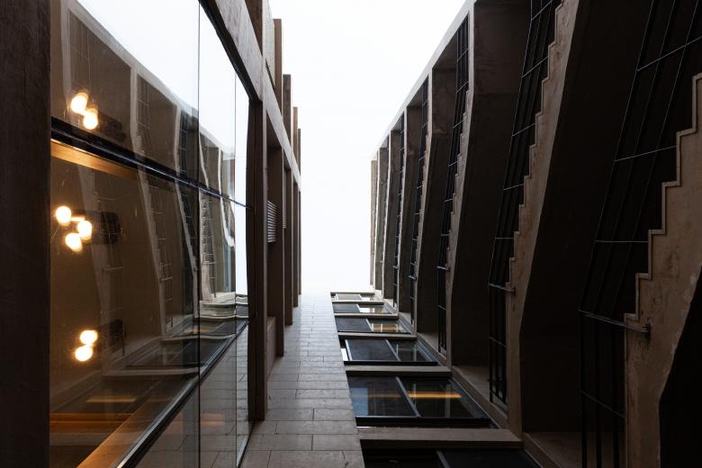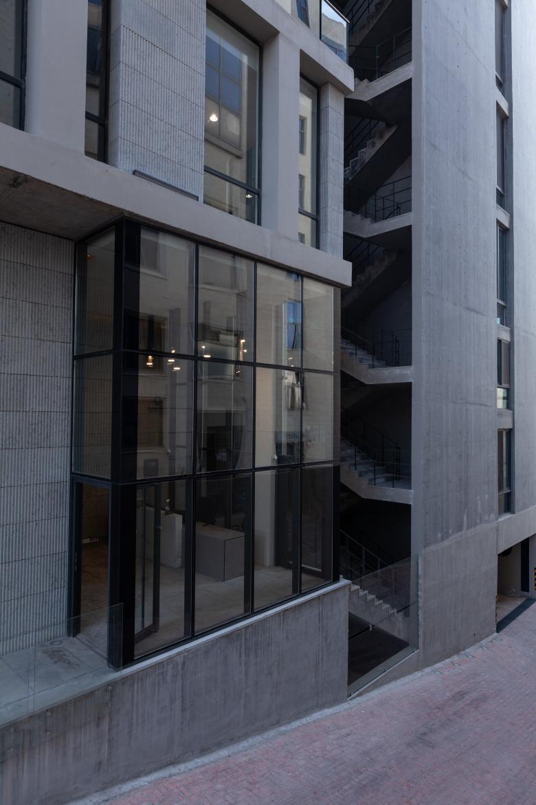 Given the simplicity of the massing, the materials used had to be distinctive. For the main mass this translated into a fair-face concrete grid with a dynamic interplay of glass openings and grooved stone cladding within each unit of the grid.