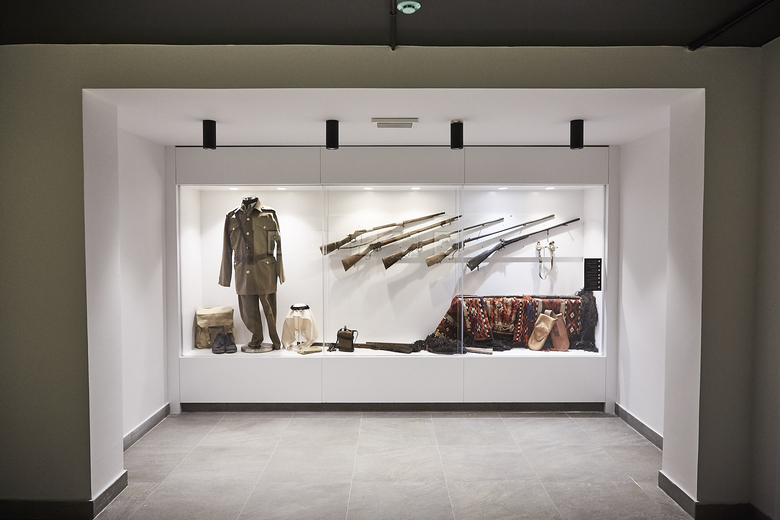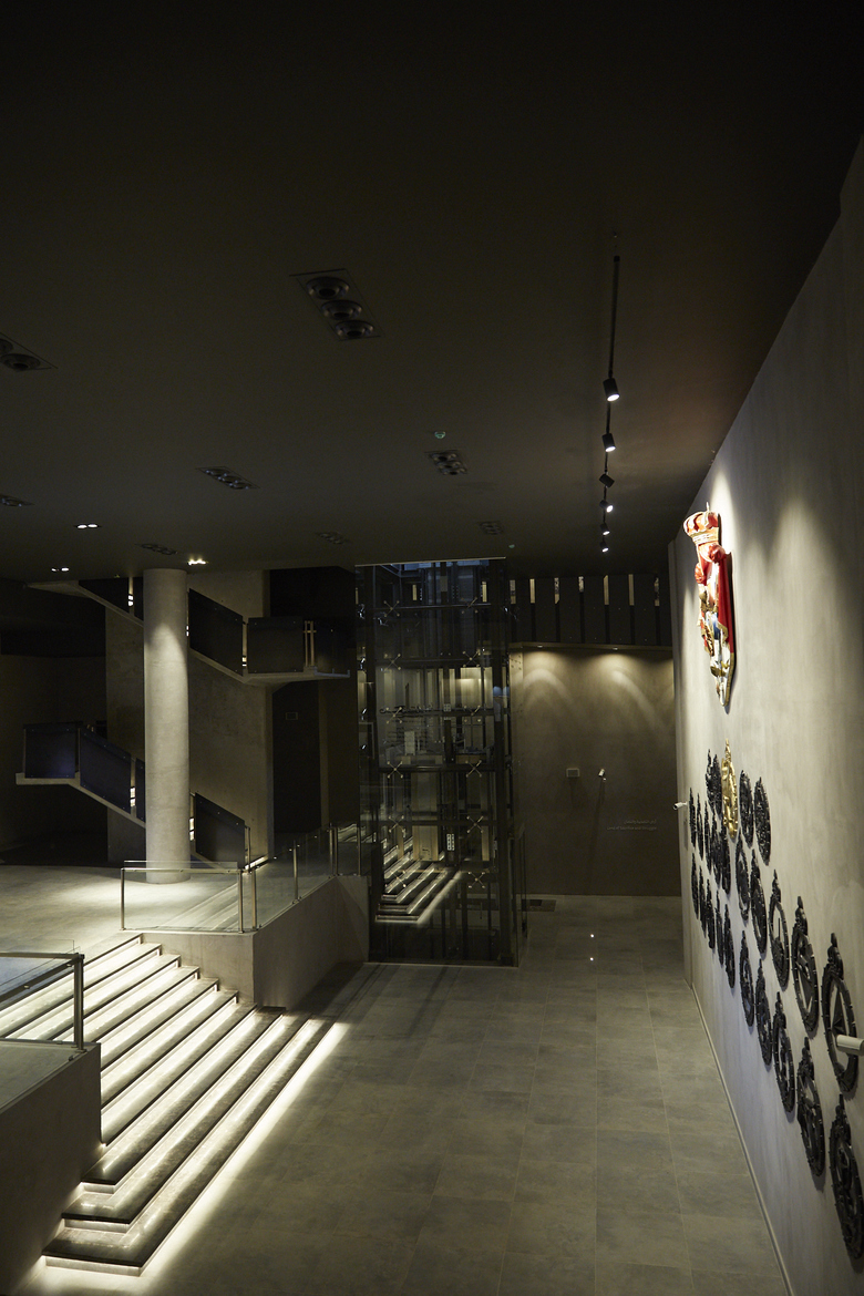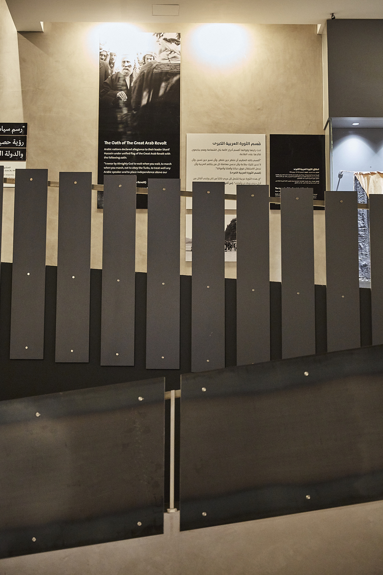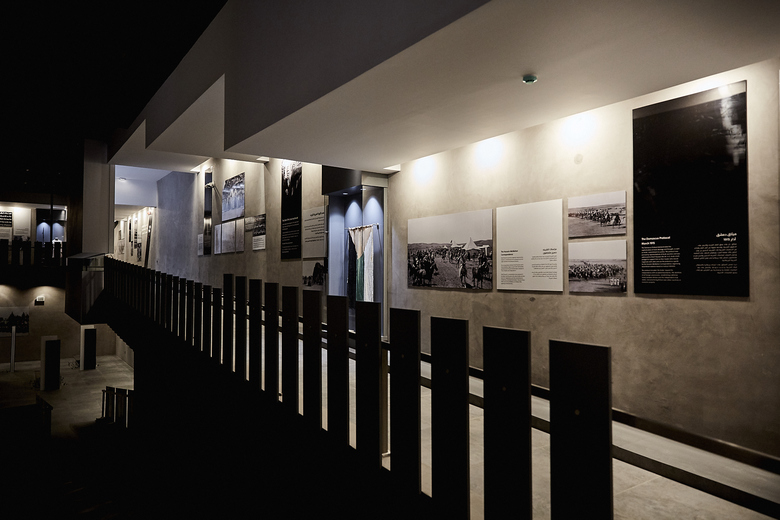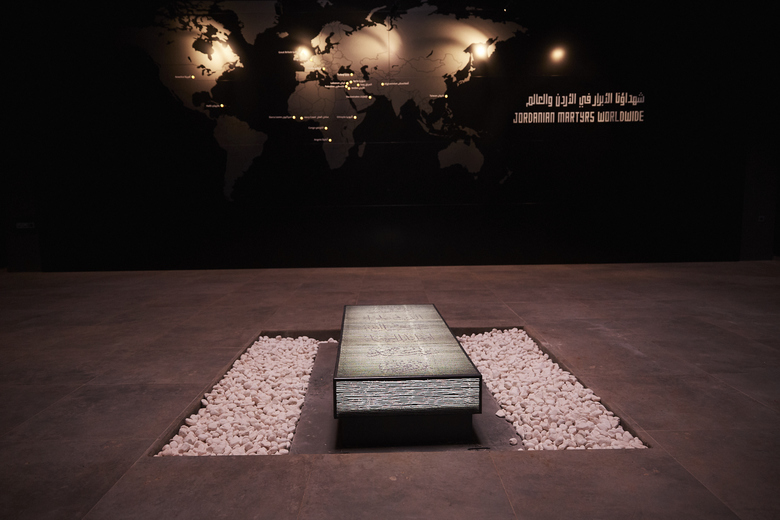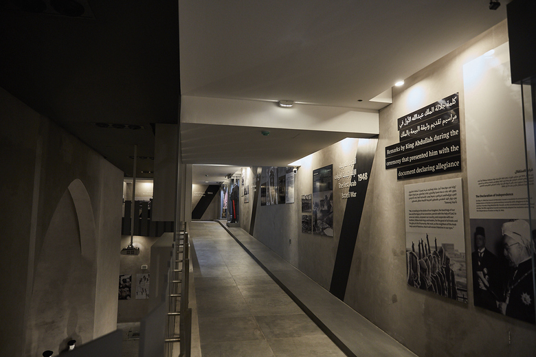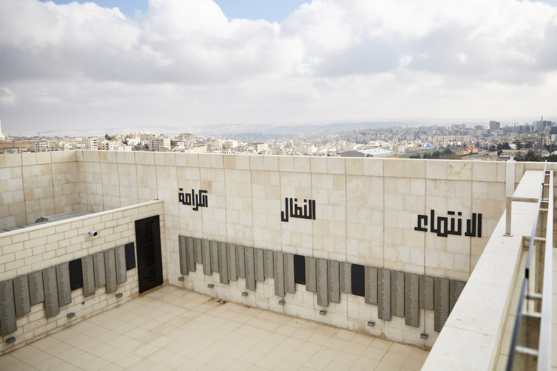 The visit begins through the battlefield on the ground floor where display units, inspired from the shrines of thousands of martyrs, stand to narrate about the sacrifices of our soldiers.A central mass has been introduced to the memorial building to celebrate the shrine of an unknown martyr. It surrounding walls are cladded with mirrors to emphasize the reflection of the principle of martyrdom on the lives of visitors.The journey on the ground floor ends with a ramp wrapping all the walls of the memorial where the story of the nation is narrated right from the beginning of the Great Arab Revolt up to this day.This ramp ends up with the Hashemite hall where the personal belongings of late Jordan’s kings are displayed in pillar-shaped cabinets facing King Abdullah II Royal chamber. The chamber overlooks an outdoor space containing martyrs names etched marble panels.