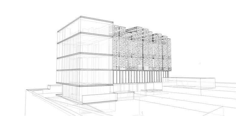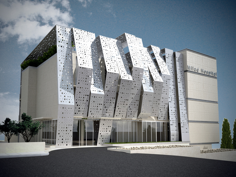 The ribs that surround and protect the breathing lungs in the human body have been used as the main design metaphor where the hospital represents a breathing lung supported by folding GRC panels, that protect the interior from environmental factors and infiltrate light. The GRC panels wrap the elevations and extend to shade the rooftop, creating shaded gardens and green pockets on the roof. Such pockets act as recovery and recreational areas for patients; making up for the lack of clean open spaces or public recreational plazas in the surrounding context of Marka.