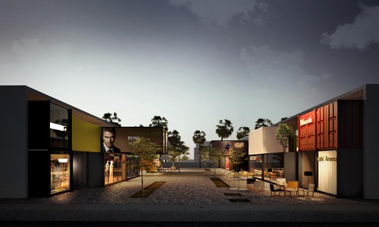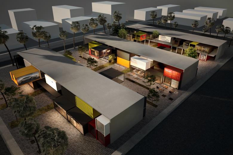 This project was designed using shipping containers that were nicely coordinated and positioned to create a town shopping center. The shipping containers were used for their efficient build time on a reasonable budget.