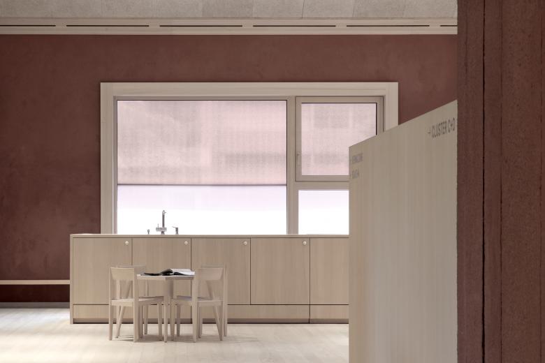 Durch eine natürliche und geerdete Materialwahl entsteht eine bodenständige und behagliche Raumatmosphäre - ein Gefühl des 'Zuhause-Seins'. Die vertrauten, regionalen Materialien – wie handverriebene Kalkputze mit lokalen Zuschlägen, sowie unbehandeltes Tannen- und Ahornholz – fördern dank ihrer Qualität die kommunale Identifikation, wodurch eine langfristige soziale Akzeptanz erreicht wird.