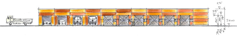Großformatige Tore aus Aluminium-Sektionen strukturieren die Längsseiten.
