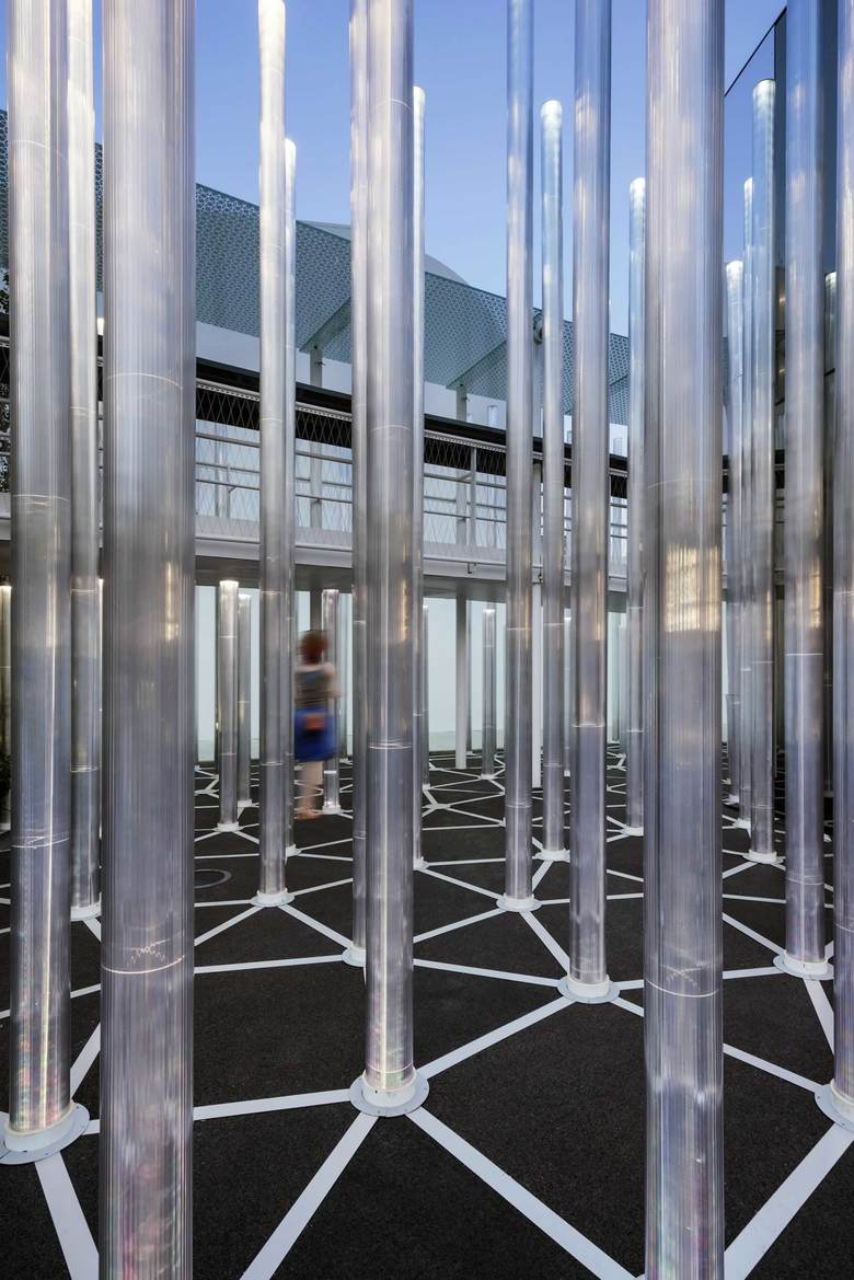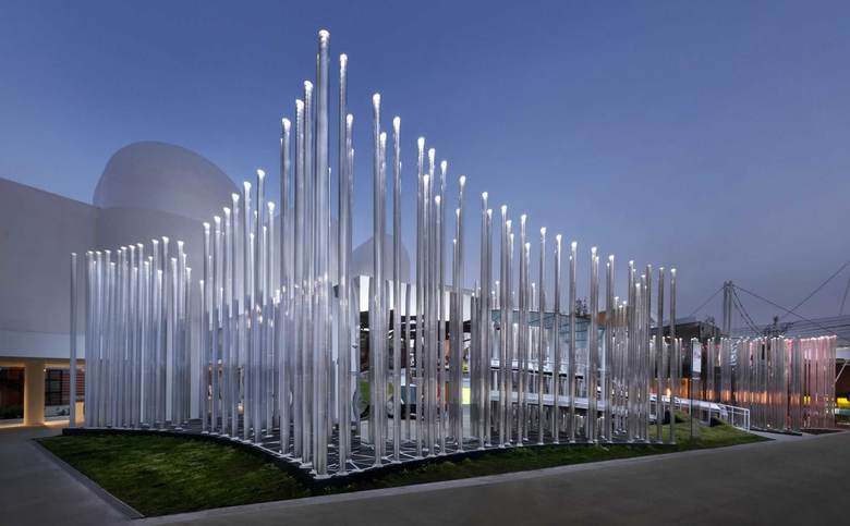 In designing the ENEL Pavilion for Expo 2015, the concept of “energy sharing” become an architectural theme, with the creation of a virtual volume: a place, generated by a grid onto which 650 polycarbonate vectors are grafted, they express the innovation of the smart grid. The pavilion occupies an area of 900 sqm, overlooking the Decumano. The initial matrix of the project is the intelligent network that ENEL created to power the EXPO site; grafted onto the network are vectors that represent the system’s nerve endings, the vectors create a virtual forest, illuminated by a series of LED lights. Enel Pavilion offers an experiential path, the visit is immersive and proposes a playful aspect that allows the visitor to penetrate freely into the “forest” and to interact with the vectors through unexpected situations of light and sound.