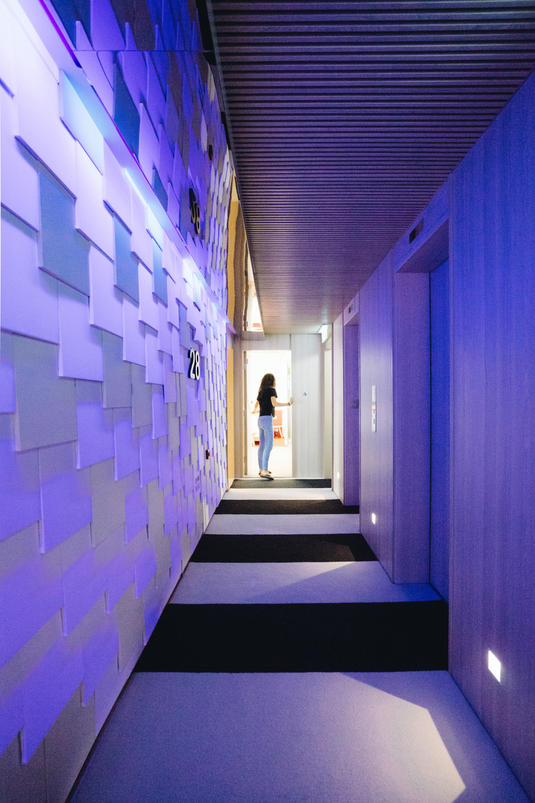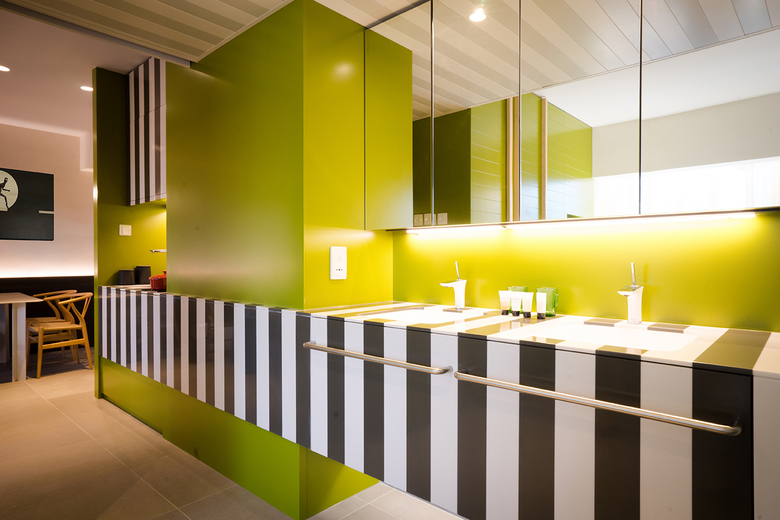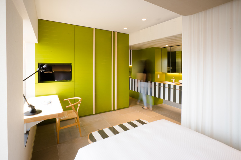 The greatest peculiarity lays on the single flat color chosen for each suite combined with a common stripped black and white pattern. Dark red, warm green, yellow and orange are the chosen colors to visually enlarge the room. The space is basically distributed to highlight the so-called living room: made of a double bed, bedside tables and Lagranja Collection furniture under a TV. To keep the space clear, the toilet has been actually enclosed in a crystal box that can be isolated by curtains when being used. The rest of functional utilities (the cooking area and the washbasin) are incorporated in the stripped Corian-made open-shelving container. This furniture unit matches perfectly with the monochrome character of each chamber while hiding drawers and cooking utensils.