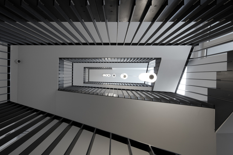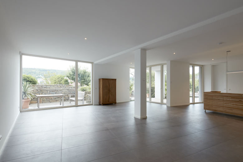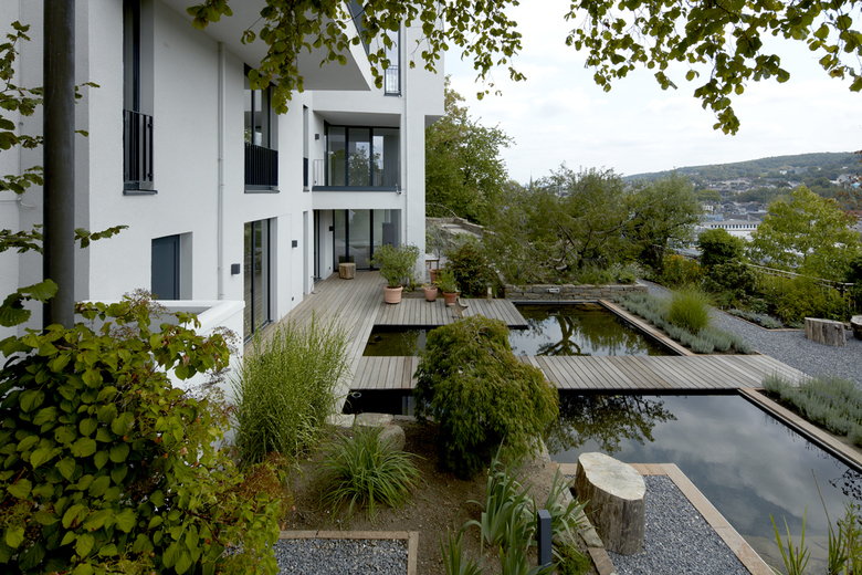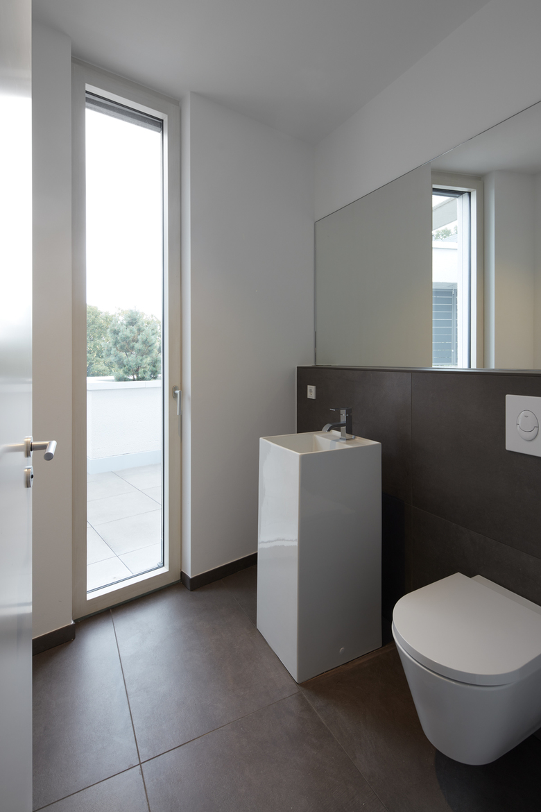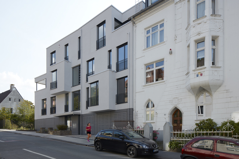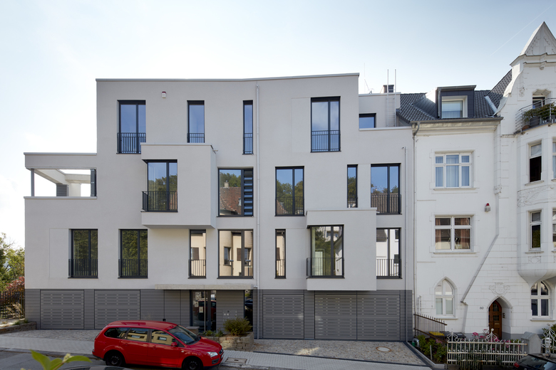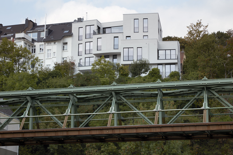 Das expressive Stadthaus an der Hangkante kontert das benachbarte Gründerzeithaus. Durch Fassaden- und Raumversprünge entsteht eine spannende Dynamik. Das 5-geschossige Gebäude bietet drei außergewöhnliche Mietwohnungen und eine Maisonette für die Bauherren. Feinsinnige Sichtachsen und maximale Bewegungsfreiheit prägen den individuellen Lebensraum. Glatte weiße Wände, geschosshohe Holztüren, großformatige Fliesen, Kamine, Aufzug, dazu der unverbaubare Panoramablick ins Tal. Gleichzeitig realisieren Fußbodenheizung, kontrollierte Raumlüftung sowie Fotovoltaik ein Niedrigenergiehaus. In jeder Ebene Balkone, die nicht einsehbar sind, ganz oben eine üppige, geschützte Außenterrasse für die Bauherren, draußen am Terrassengarten die Orangerie.