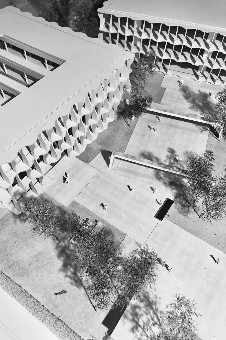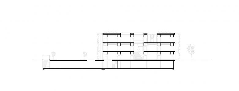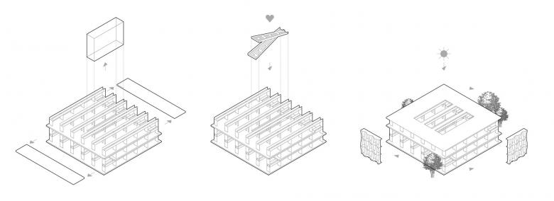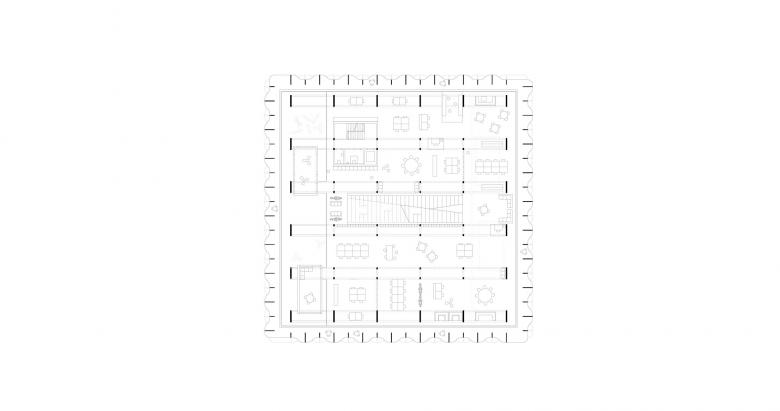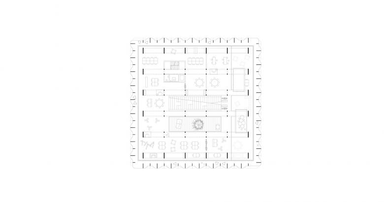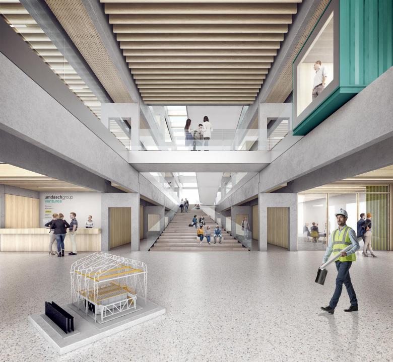 Die Deckenplatten können hinzu- oder weggeschaltet werden. Eine Scherentreppe im mehrgeschossigen Atrium verbindet die Etagen kommunikativ und dient als Herz der Anlage. Die Fassadenlamellen schaffen einen begehbaren Filterraum zur heterogenen Umgebung des Industriegebiets von Amstetten, dienen als Sonnenschutz und geben dem Ort seine unverwechselbare Identität.