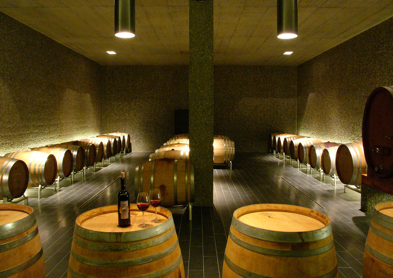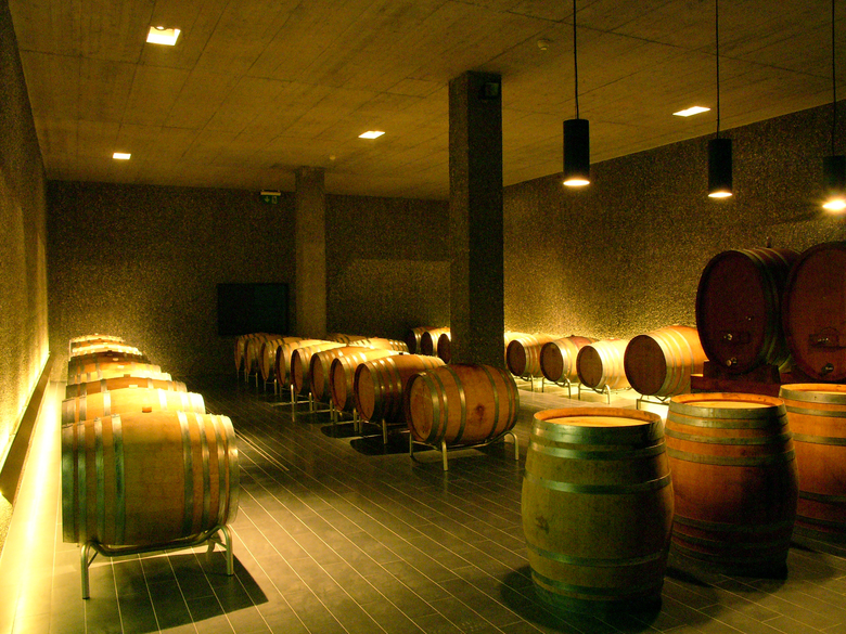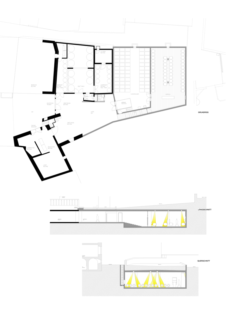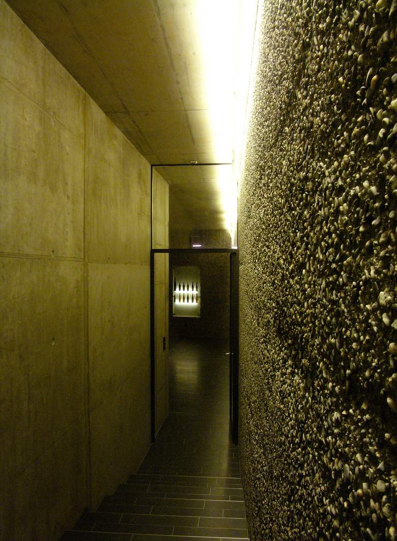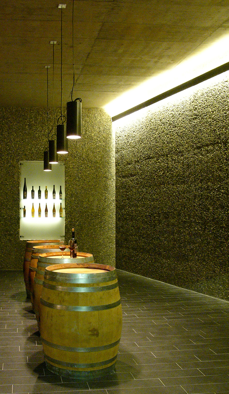 Dort, wo im idyllischen Weinort Fläsch die Strasse zwischen den alten Weinhöfen eng wird, da öffnet sich der Hof des Weiguts Marugg. Am Rauputz des alten Hauses mit der Jahreszahl 1789 über der Tür rankt der Wein. Ein Brunnen, Blumen und Kinderspielzeug im Hof, die Stalltür unter dem ornamentalen Mauerbogen steht halb offen. Niemand würde hier einen modernen Kellereibau vermuten. Gleich hinter dem Marugg-Hof beginnt das Kirchengelände, das Nachbarhaus beherbergt ein edles Gourmet-Restaurant und Architekt Hauenstein hat um die Ecke sein Atelier. Wie sollte man an dieser Situation noch planen und bauen? Thomas Marugg ist in der dritten Generation Winzer, und die vierte spielt schon im Hof. Er ist ehrgeizig und innovativ, nicht nur mit seinen Weinen, sondern auch in der Architektur. Ein hübscher Verkostungsraum bestand bereits, als er sich entschloss, einen neuen Barrique- Keller zu bauen, um mehr Wein besser ausbauen zu können. Auch er besitz zur Vergärung noch teilweise die alten Schweizer Stahltanks mit der Innenbeschichtung, die nach seiner Meinung die Weine nicht so hart werden lässt wie ein Edelstahltank. Es war ein Tiefbau-Kunststück, in diesen beengten Verhältnissen den neuen Keller unter die Erde zu legen. Aber es hat sich gelohnt. Eine Rampe mit schwarzen strapazierfähigen Graniti-Fliesen führt in die Tiefe, begleitet von der glatten Sichtbetonwand unter dem Altbau, gegenüber kontrastiert von einer Wand aus seidig glänzenden, dunklen Rheinkieseln, deren Zementschicht nach dem Ausschalen sofort ausgewaschen wurde. Die raffinierte Beleuchtung aus dem Deckenschlitz arbeitet diese ungewöhnliche Struktur fein heraus. Eine Glastür im schmalen Rahmen aus geöltem Stahl öffnet sich in den neuen Barrique-Keller, in dem sich das schon entlang der Rampe angeschlagenen Materialthema der Wände aus Rheinkieseln unter der glatten Sichtbetondecke über dem schwarzen Boden voll entfaltet. Ein Schön beleuchteter Raum, in dem die Fässer fast golden schimmern und auf hochgestellten Barriques Fassproben gereicht werden. Sehr stimmungsvoll!
