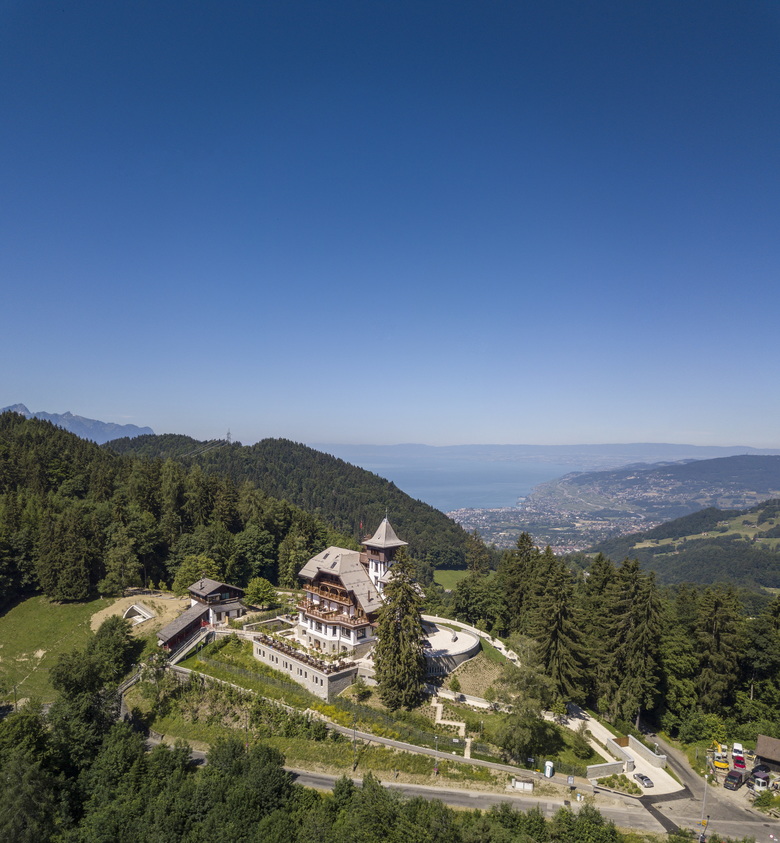 The Hotel de Sonloup built in 1911 saddled on the top of the hills above Les Avants at 1'550 ms above sea level, overlooking Montreux and the Leman Lake with spectacular view to the surrounding landscape and accessible by a purpose built funicular. After a period of closure during the First World War it was bought by a public transport syndicate and later opened as a hotel again.