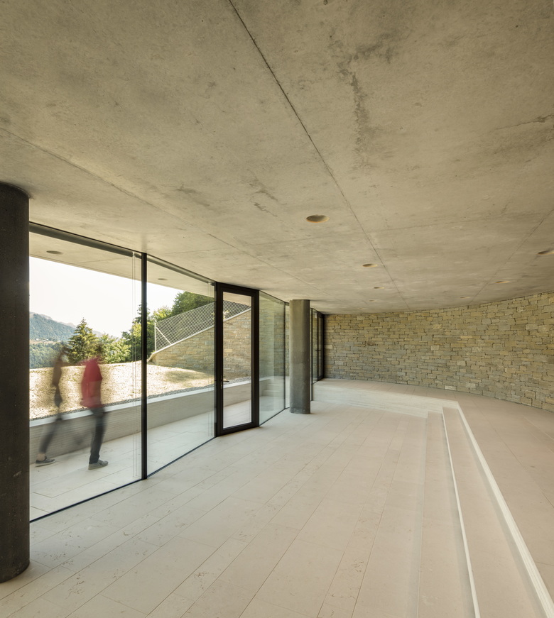 Multiple extensions were developed, nearly doubling the original surface of the hotel. A new wing was added on the south-western side, housing all clinical amenities and the spa on the lowest level, new bedrooms were introduced under the rebuilt terrace on the eastern side and kitchen, storage, technical, parking, deliveries and services accommodated below the remaining base on the remaining sides. An additional meditation space was embedded in the rock face, accessed by an excavated tunnel, opening to face the view of the surrounding peaks on the eastern face of the hill.