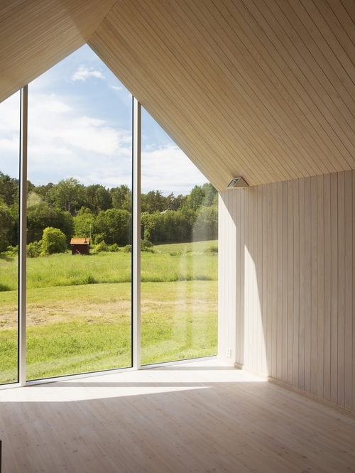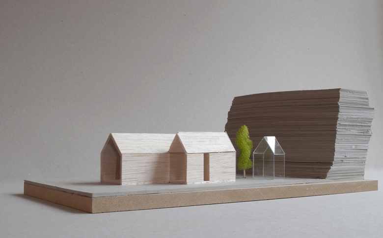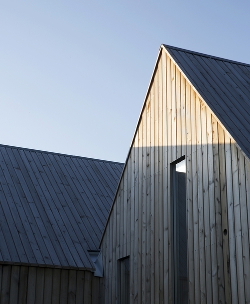 Toward the northeast, a hill borders and defines the site, together with the view in the opposite direction. The spatial interaction between landscape and the structure creates a beneficial microclimate. This is reflected by the structures’ southwest orientation, where the gable end is glazed. In the other directions the buildings appear more closed.