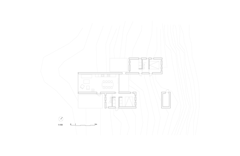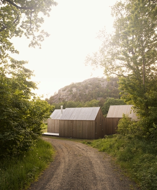 The client wanted a cabin for the whole family, but at the same time it needed to be divisible in some way. The solution was a cluster of three structures, which can be used individually. Each of the buildings is defined as a clarified geometric volume, organized around the outdoor area that binds them together as one unit.