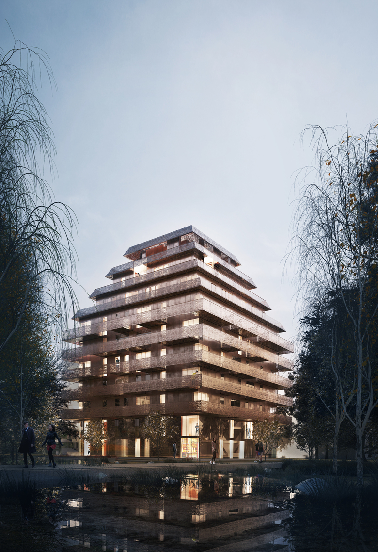 Developed for Solon Eiendom, the copper housing complex consists of 50 apartments with generous openings and private exterior spaces. The play of the tower geometry allows all apartments generous ceiling heights and sheltered terraces. Ski Vest Reiulf Ramstad Arkitekter’s tower is wrapped by linear copper terraces with a characteristic pattern giving the project a unique language.
