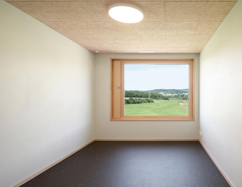 Im Inneren wurden bewusst reizarme und robuste Materialien eingesetzt. Die dezente Farbgebung und der Einsatz von Holz erzeugen eine beruhigende und wohnliche Atmosphäre. Auf jedem der drei Geschosse befindet sich eine 4er-Wohngruppe. Alle Zimmer verfügen über einen Ausblick zur Landwirtschaftszone und ein eigenes Bad. Dazu gehören Gemeinschaftsräume für Kochen, Essen und Wohnen sowie Ateliers, ein Fitness- und Therapiebereich und Büros für das Betreuungspersonal.
