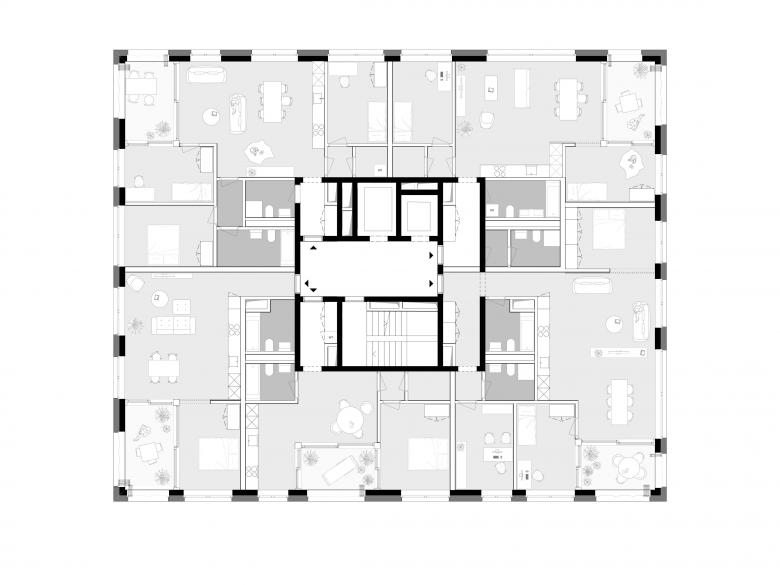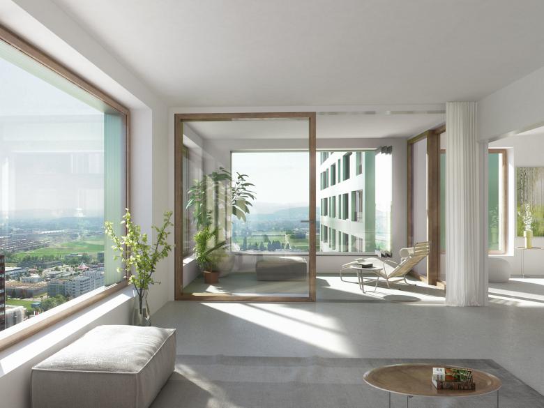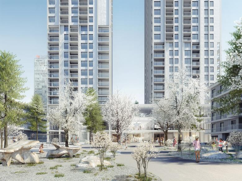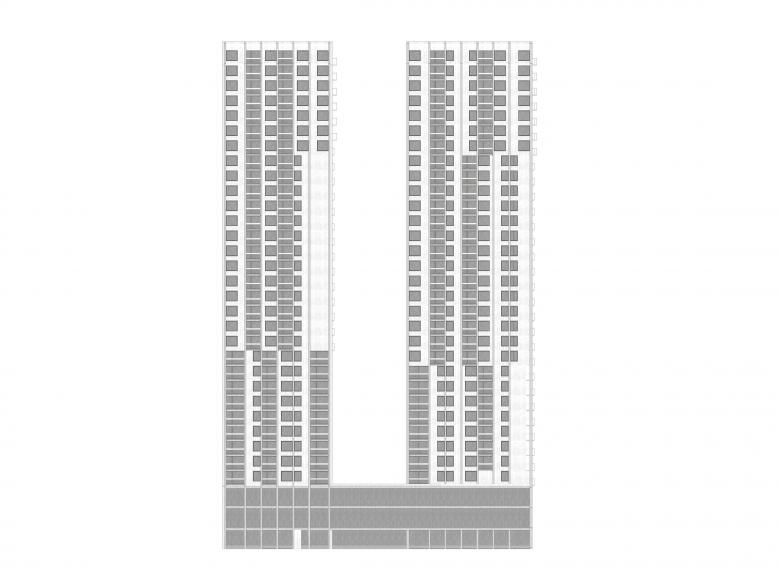 Zwei Doppelhochhäuser ersetzen die beiden im Richtplan vorgesehenen grossen Türme. Für Spreitenbach bedeutet dies mehr Aussicht auf den Himmel, weniger Schattenwurf und eine bessere Einbindung in die bestehende Ortsstruktur. Die verbindenden Sockelbereiche dienen als Convenience- Cluster und vermitteln die Masstäbe der Hochhäuser mit der umliegenden Nachbarschaft. Trotz Grossmasstäblichkeit entsteht somit ein Gemeinschaftsgefühl und eine Stimmung von angenehmer Nähe.