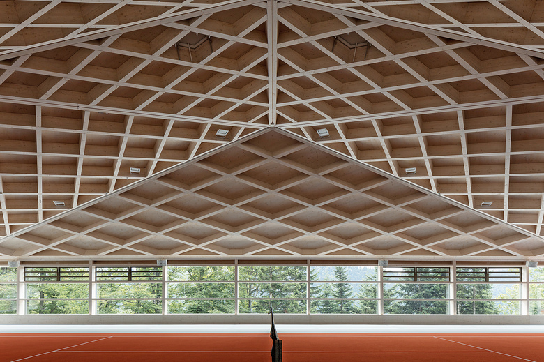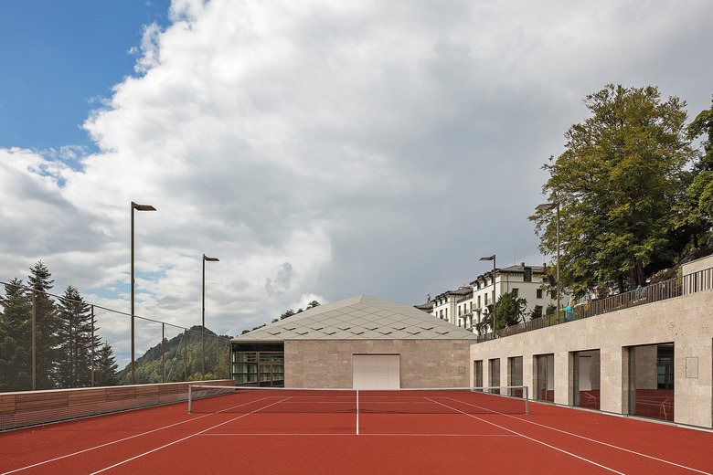 Die Gebäudeteile sind symmetrisch, um einen zentralen Außentennisplatz, organisiert. Zwei identische Tennishallen mit kristallförmigen Dächern begrenzen den Platz an dessen Querseiten. Ein Clubhaus mit Bar, Garderobe und Rezeption bildet den Abschluss an der bergzugewandten Längsseite. Von der Konzeption der historischen Anlage abweichend, bei der das Clubhaus an der Straße lag, wurde es unter die Straße verlegt und erschließen es vom Straßenniveau über einen Eingangspavillon. Die Servicestraße für Anlieferungen und das Parkhaus verstecken sie unter dem Platz und den Hallen, so dass die Spieler vom Verkehr nicht gestört werden.