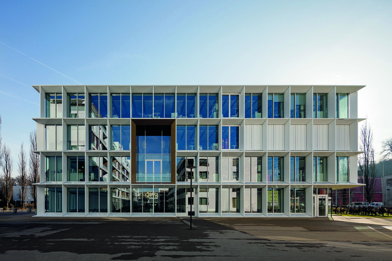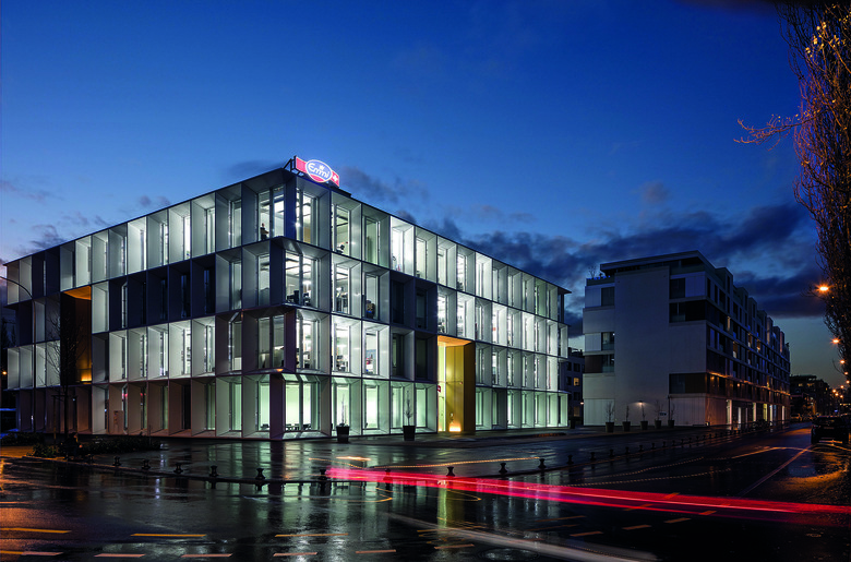 Der neue Konzernhauptsitz von Emmi mit 200 Arbeitsplätzen präsentiert sich als Solitärbau mit vorgelagerter Piazza. Das äussere Erscheinungsbild ist von der einer Rasterfassade bestimmt. Der in der Grundfläche quadratische Baukörper mit seinen vier Geschossen, wirkt zusammen mit den spiralförmig angelegten zweigeschossigen Kommunikationsräumen sehr offen und lichtdurchflutet.