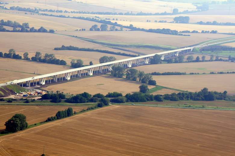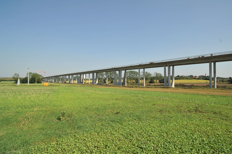 Im Zuge der ICE-Neubaustrecke Erfurt-Leipzig/Halle quert die filigrane Brücke in exponierter Lage ein flaches Tal. Ihr zweistegiger Spannbetonplattenbalken gliedert sich in zehn fugen- und lagerlose Feldträger. Die horizontale Queraussteifung erfolgt über Einspannung an den Widerlagern und Stahlbetonrahmen in den Fugenstützen- achsen der Bauwerkabschnitte. Die Aufnahme der Bremskräfte erfolgt ebenfalls über die Widerlager und über die paarweise mittig in jedem Fünffeldträger angeordneten, sehr steifen Bremsbockrahmen aus Stahlbeton. Die gewählte Fugeneinteilung ermöglicht eine durchgehende Schienenführung ohne Schienenauszüge. Die durch die geringe Stützweite realisierbare niedrige Überbauhöhe sowie die schlanken Einzelstützen lassen das Bauwerk elegant und leicht erscheinen. Es zeichnet sich durch sein robustes und reduziertes Tragwerk sowie einen geringen Wartungsaufwand aus.