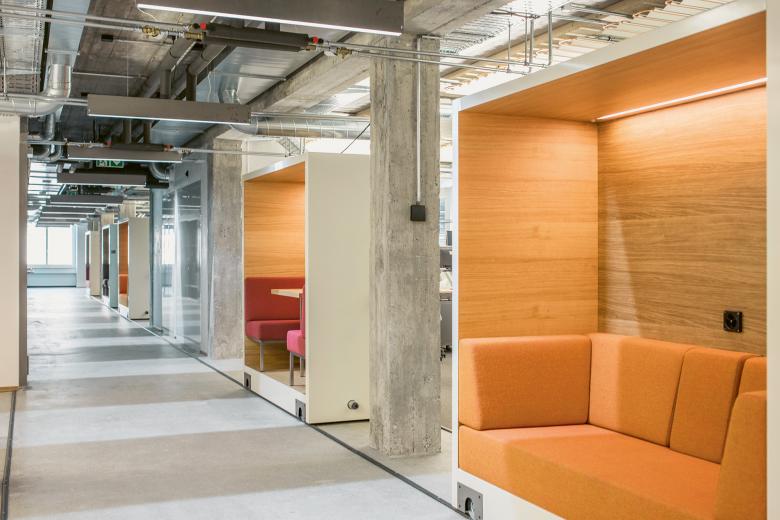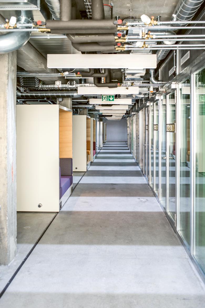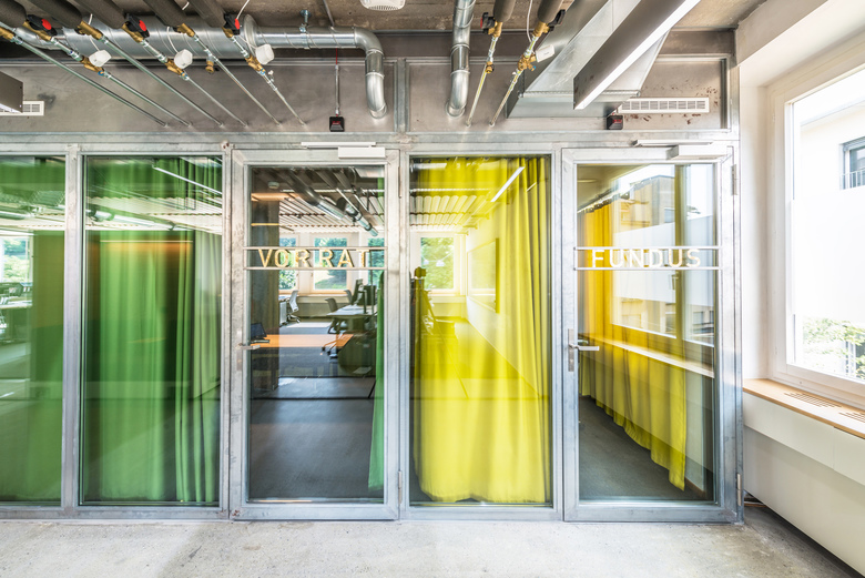 In order to provide employees with an inspiring, individual workplace, priority was given to a functional, flexible spatial concept, expressed with simple, industrial materials. The levels were stripped down to their raw structure by sandblasting and exposing the buildings original reinforced concrete construction. The office floors’ atmosphere is characterised by simple and raw materials, such as the installation of almost untreated metal and glass partitioning systems, the existing cement screed, which was refined by sanding, and space-shaping textiles. Monochrome fabrics offer privacy and darken the interiors as needed. The raw character is reinforced by the carefully installed exposed building services.