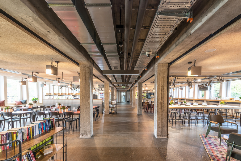 An orangerie with hammocks, a break room with high-quality vintage furniture and a restaurant structured by means of islands and zoned into segments appear playful and uncomplicated. Taken together, these design measures offer a professional and creative working environment that enables diverse settings for employee interaction and concentration.