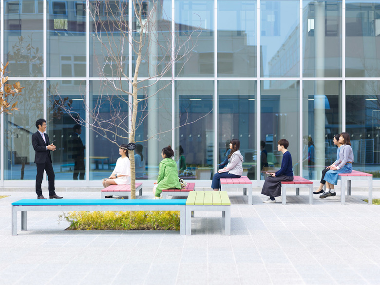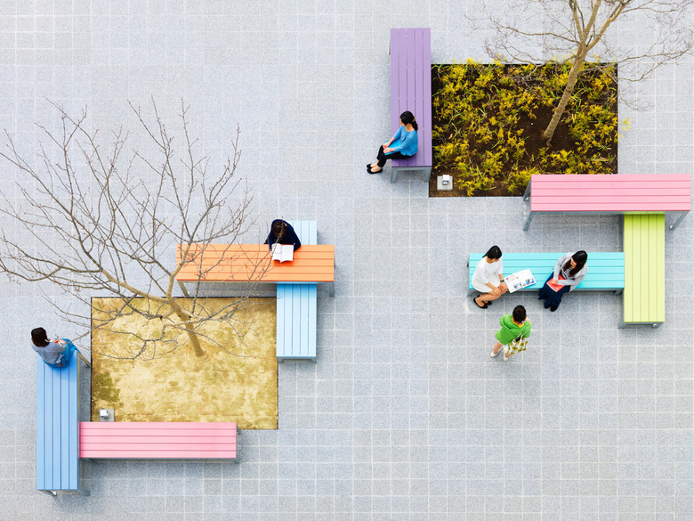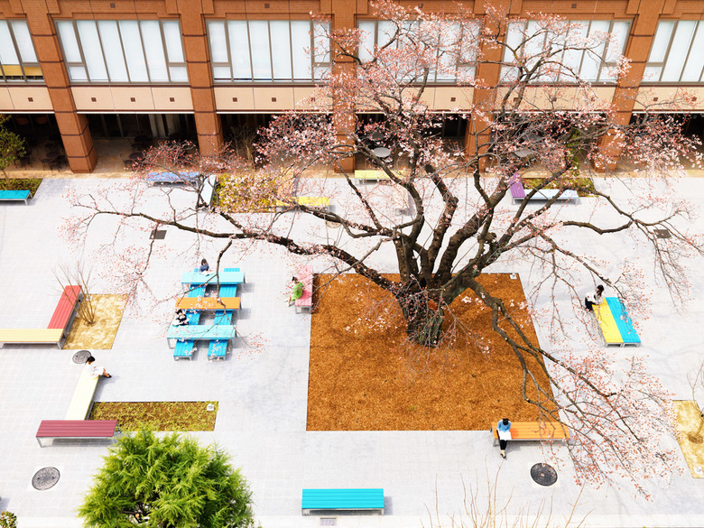 We have dotted the open area with trees that create shade and colorful benches of varying heights. Align them, link them, stack them, the benches can be arranged to cater for various activities on campus. The students can eat, talk, read, study, or even take a nap on the benches. The colors of the benches and their applications were co-designed with the students themselves. The students learn design concepts by creating an area and then observing how their area is used by other.