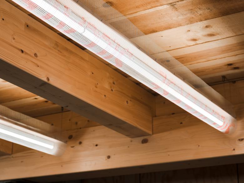 In the open-plan and private offices on the ground floor, the combination of direct and indirect lighting ensures bright, pleasant workspaces. The lighting supports working with a uniform, bright and glare-free ambience. The lighting solution consists of "light hacks" - this is what Studio De Schutter calls price-optimised semi-bespoke luminaires that were created from standard elements and simultaneously respond to individual project requirements. The linear lighting consists of reclaimed wooden boards, LED light strips for indirect lighting and diffuse light tubes that have been combined to create pendant luminaires. To minimise glare (UGR) from the diffuse LED linear luminaires, this "light hack" was wrapped with fabric. Samples and mock-ups were used to test various perforated materials to optimise the light output and examine the energy consumption. In the end, an industrial fabric made of non-flammable material was used.