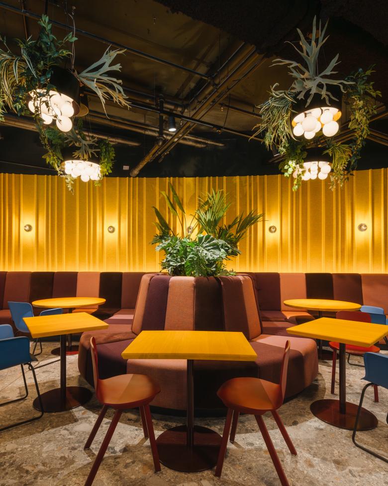 A particular challenge was not only the preservation of the postmodern jewel designed by gmp Architekten in 1980, but also the location of the restaurant in the basement of the Hanseviertel. Studio De Schutter created an atmosphere that invites you to linger in winter and summer, day and night. The lighting concept balances the different lighting conditions between bright daylight zones and low-light areas by compensating for the lack of daylight on the one hand and setting specific accents on the other. The attraction and highlight of Le big TamTam is the centrally located bar under the dome. With a total of five horizontal planting rings, the bar construction extends beyond the first floor of the Hanseviertel providing the necessary long-distance effect and orientation. In order to do justice to this exposed location and to precisely coordinate the lighting with the construction and monument authorities, Studio De Schutter and the planning teams of studio aisslinger and gmp Architekten built a section of the centerpiece as a 1:1 model. More than one hundred LED cabochons – the typical fairground canopy lights – announce Le big TamTam. Studio De Schutter staged the lighting of the plants arranged in rings with integrated zoom spotlights.