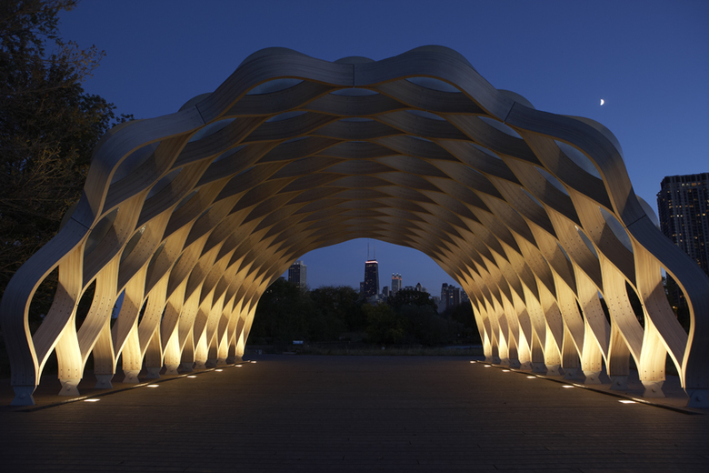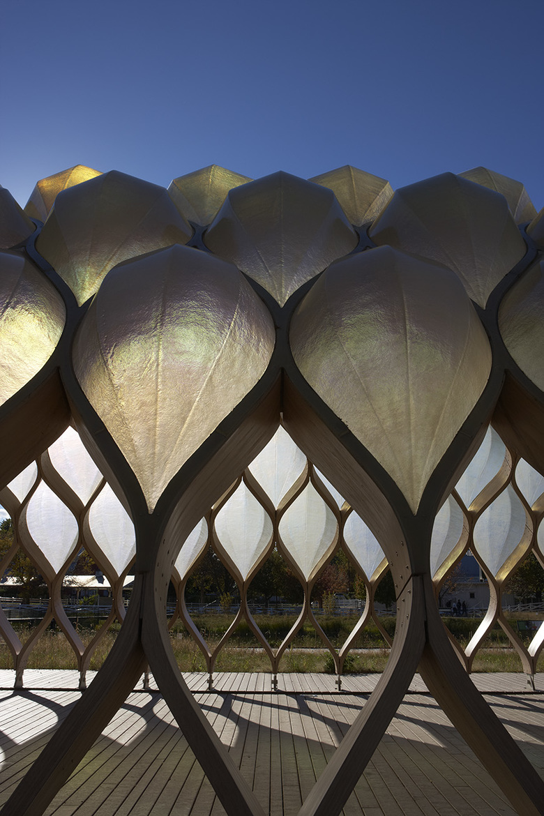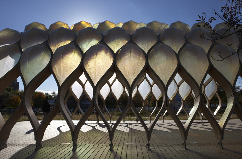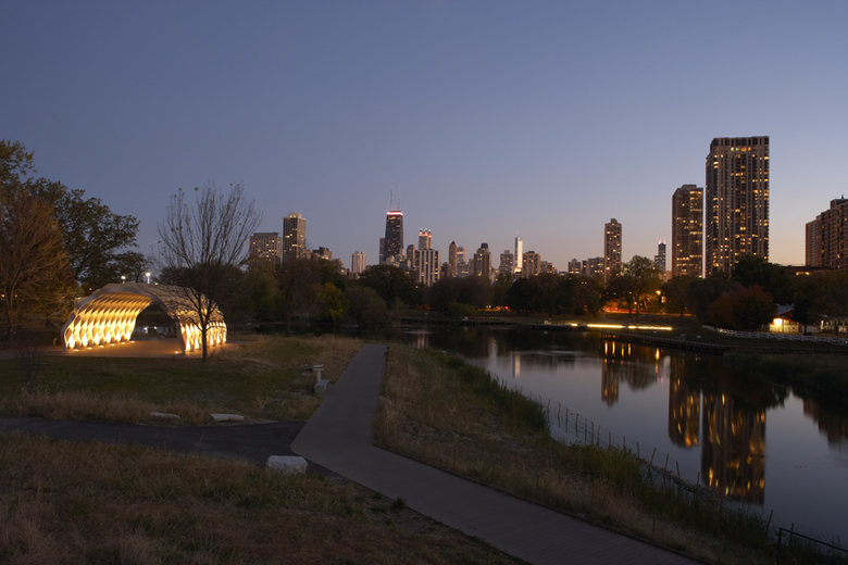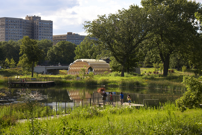 A new boardwalk circumscribing the pond passes through various educational zones that explicate the different animals, plants, and habitat found in each. A pavilion integrated into the boardwalk sequence provides shelter for open-air classes on the site. Inspired by the tortoise shell, its laminated structure consists of prefabricated, bent-wood members and a series of interconnected fiberglass pods that give global curvature to the surface.
