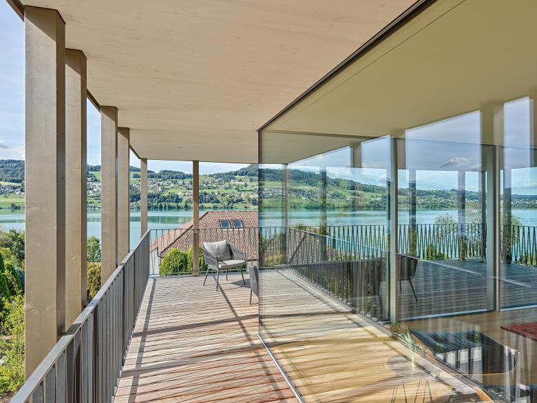 Im neu erstellten Entree gibt die vollflächige Verglasung den Blick frei auf das Atrium mit angegliedertem gedeckten Morgensitzplatz. Der Wohn- und Ess-/Küchenraum befindet sich innerhalb der alten Struktur, wurde jedoch so weit wie möglich geöffnet und mit einer grossen umlaufend gedeckten Veranda, welche den Blick zum See hin frei gibt, erweitert.