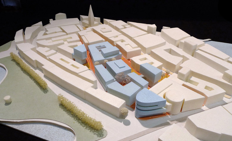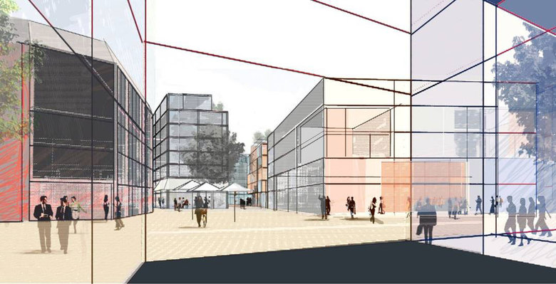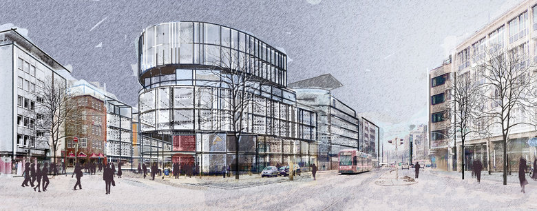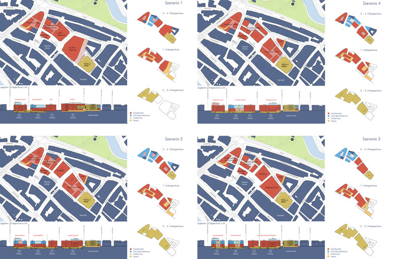 Besonderes Potential ist dabei der Rückbau großflächiger, nur noch teilgenutzter Kaufhäuser zu Gunsten einer Wiederherstellung historischer Straßenzüge, neuer Stadträume und lebendiger Einzelhandelshöfe, in denen sich unterschiedliche gewerbliche Nutzungen und Wohnen überlagern. Mit der Neuordnung von unterirdischer Andienung und ruhendem Verkehr können darüberhinaus bestehende, großmaßstäbliche Parkhäuser entlastet und mit urbanen Funktionen ergänzt als nutzungsflexible Bausteine nachhaltig in das Stadtgefüge integriert werden.