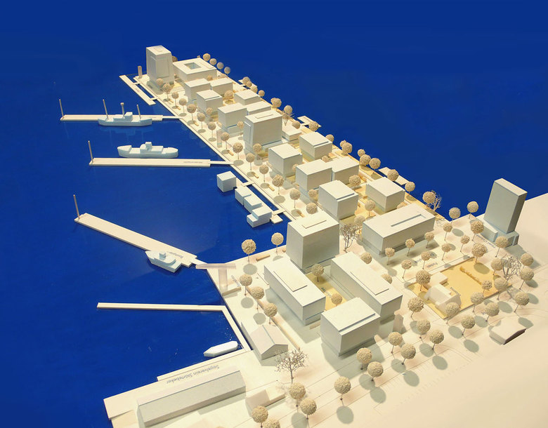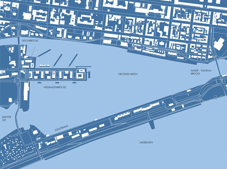 Die Wiesbadenbrücke, eine in den Großen Hafen ragende, ehemals von der Marine genutzte Halbinsel, soll zu einem maritimen Quartier mit hohem Wohnanteil entwickelt werden. Das städtebauliche Quartiersgefüge leitet sich zum einen von rational organisierten Hafenstrukturen ab, zum anderen ist es durch eine starke Durchgrünung und landschaftliche Einbindung geprägt.