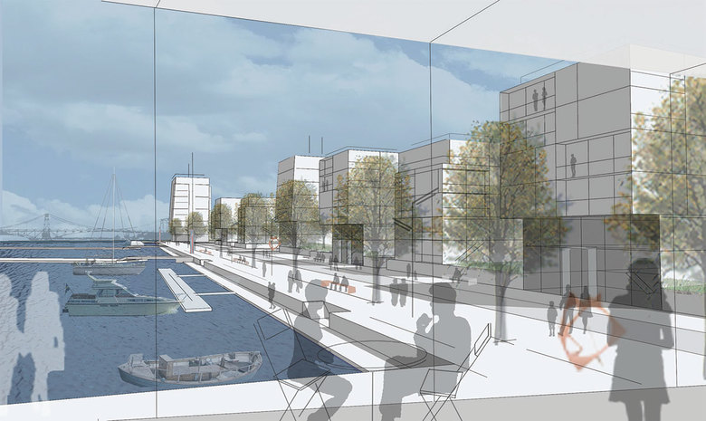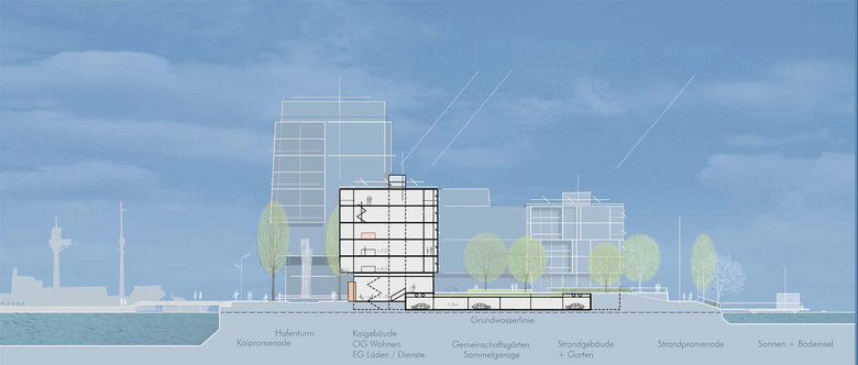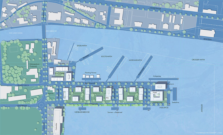 Lineare, auf Warftebene angehobene und von Garagen unterbaute Baufelder werden durch uferverbindende Quartiersplätze gegliedert und von Promenaden eingerahmt. Die zu den vorhandenen Piers und zum künftigen Museumshafen im Norden orientierte belebte „Kaipromenade“ wird durch den rhythmischen Wechsel von baumbestandenen Gärten und kräftigen, modularen Bausteinen mit erdgeschossigen Dienst- und Versorgungseinrichtungen gefasst. Nach Süden vermittelt die „ruhige“ Strandpromenade zwischen höher liegenden, privaten Gärten und dem vom alten Baumbestand gesäumten Landschaftsufer. Eine offene und versetzt angeordnete Bauweise gibt allen Wohnungen Blickbezug zum Wasser.