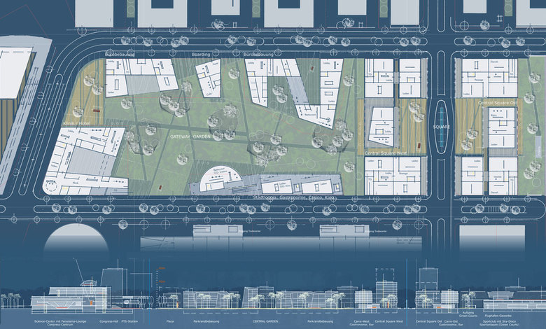 Mit singulärer Raum- und Landschaftskonzeption antwortet der Entwurf für das Gateway Garden Quartier auf den extremen Standort Frankfurter Flughafen/Frankfurter Kreuz und inszeniert mit seiner grünen Mitte das außergewöhnliche Milieu eines Airport-Campus.