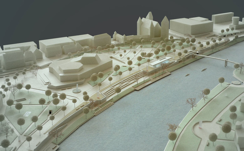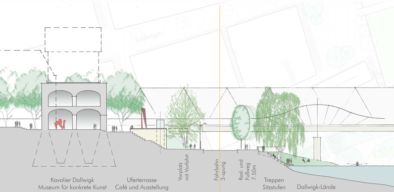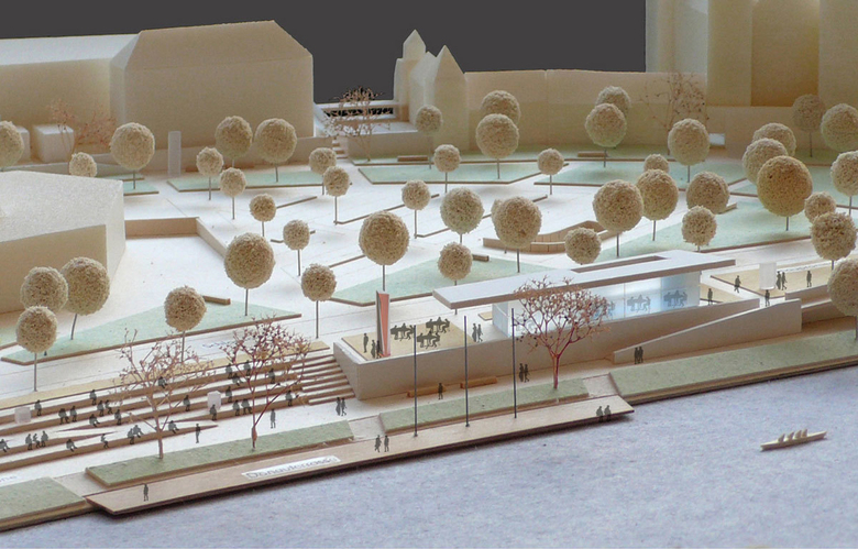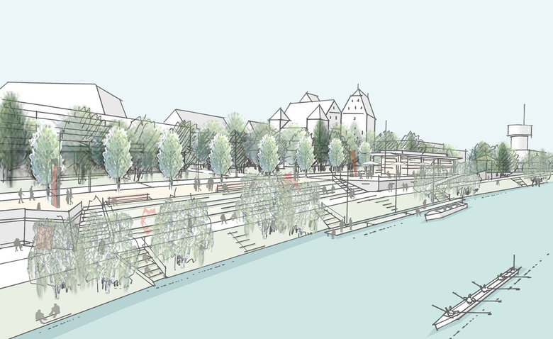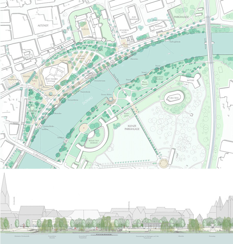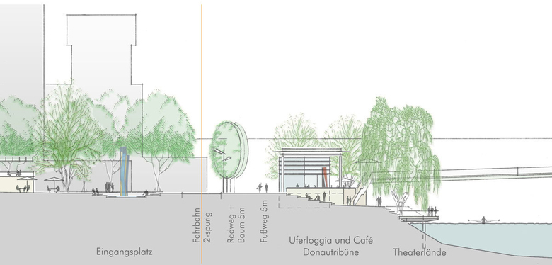 „Die Innenstadt an die Donau bringen“ – für dieses Ziel wird der das Theater umgreifende Stadtraum von Schloss- und Donaulände über die Uferstraße hinweg mit langgezogenen Terrassen an den Fluss geführt. Dies erfordert ein Verschlanken und Verschieben der heute vierspurigen Uferstraße nach Norden, sodass dem Flussbogen folgend eine langgezogene, spindelförmige Uferpromenade entsteht, die sich vom Tränktor bis zur Bastion Dallwigk spannt und mit differenzierter Zonierung und einem Uferpavillon mit Café unterschiedliche Aufenthaltsqualitäten und Flusserlebnisse bietet.
