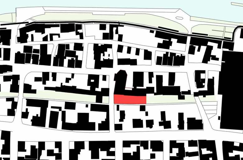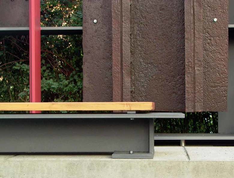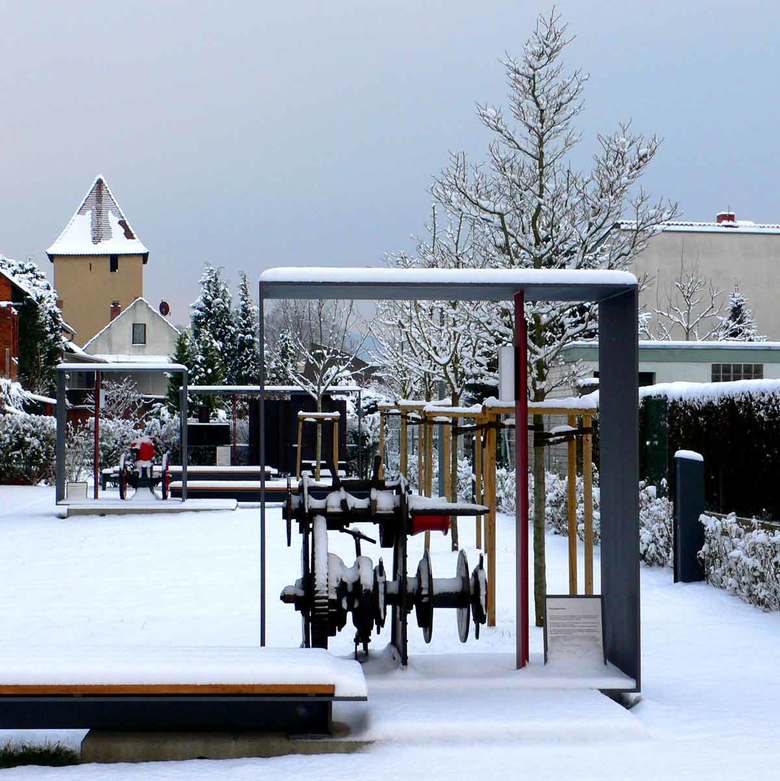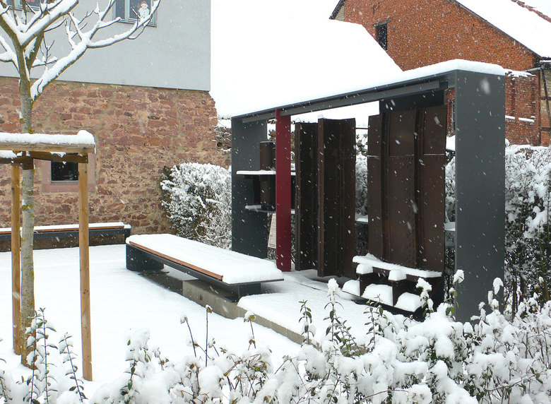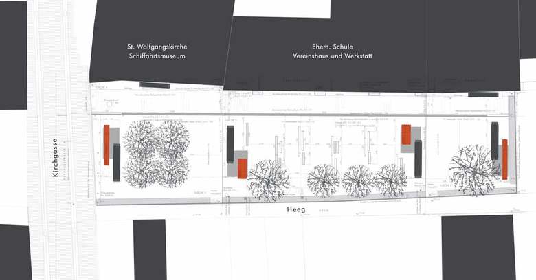 Auf einer schmalen Gartenparzelle vor der zu einem Schifffahrtsmuseum umgebauten St. Wolfgangskirche werden Fragmente und Objekte des Schiffsbaus in Stahlrahmen ausgestellt, die als stilisierte Vitrinen und Raumobjekte den Museumsgarten gliedern und zonieren und zugleich auf das benachbarte Museum hinweisen.