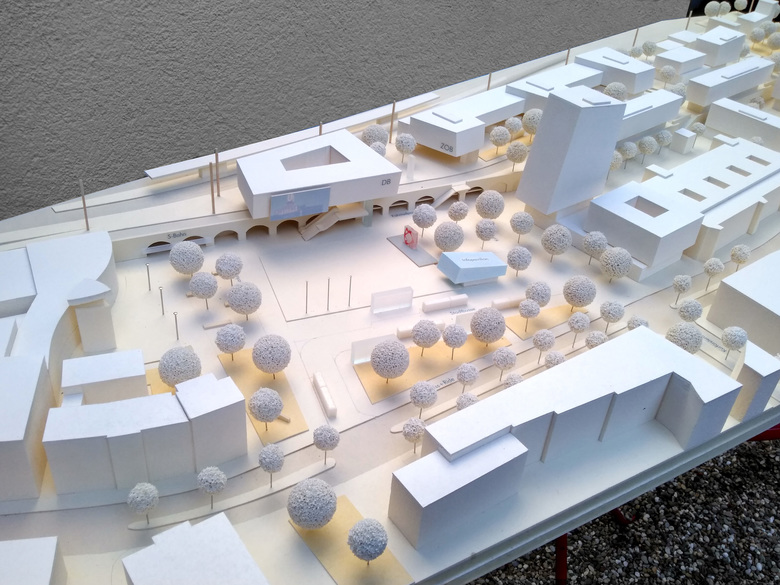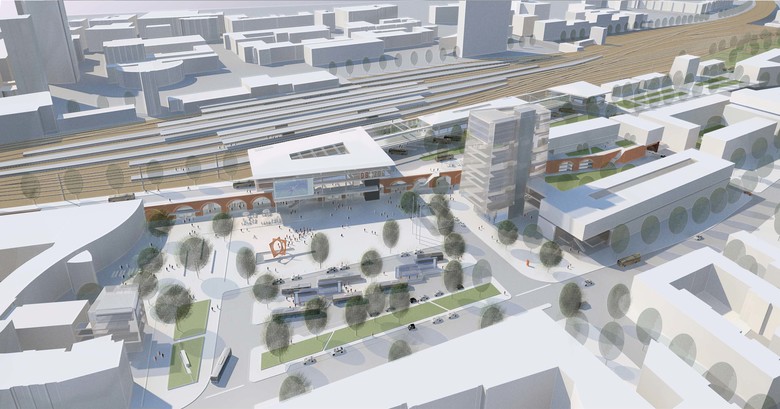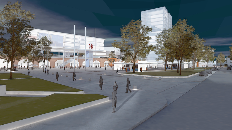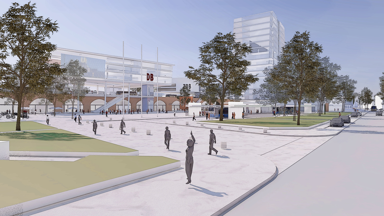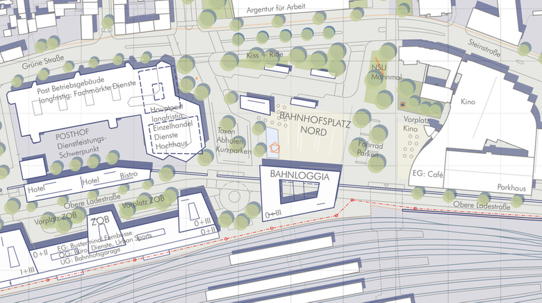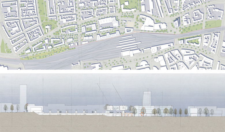 Entlang der Bahnkörper bilden zu einer Gesamtfigur zusammengefasste Bahnloggia und Busterminal mit westlich angrenzenden Wohnquartieren und vorgelagertem Gleispark einen rhythmisch gegliederten, durchgrünten und ansprechenden Bahnprospekt.