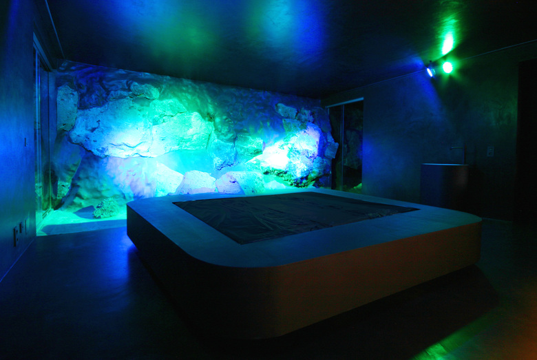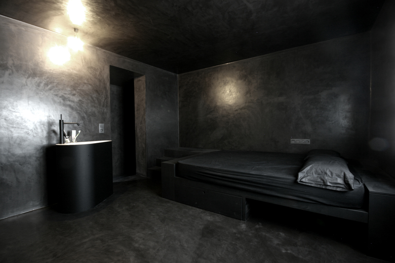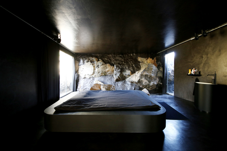 Der rückwärtige Teil des Hauses wird mit dem Wohnraum über einen Hof und die grün gehaltene Küchenflanke erschlossen. Die hangseitigen Räume sind komplett mit schwarzem Microzement überzogen und erzeugen so eine intime und mystische Stimmung. Die beiden Räume dienen als Schlafzimmer. Sie funktionieren autonom mit jeweils einer gleichartigen Nasszelle. Der grössere Felsenraum ist inszeniert mit der freigelegten Basaltgesteinsschicht. Sie wird über die beiden Glasschiebetüren ohne Unterbruch ins Äussere gezogen und bildet die dominante Rückwand.